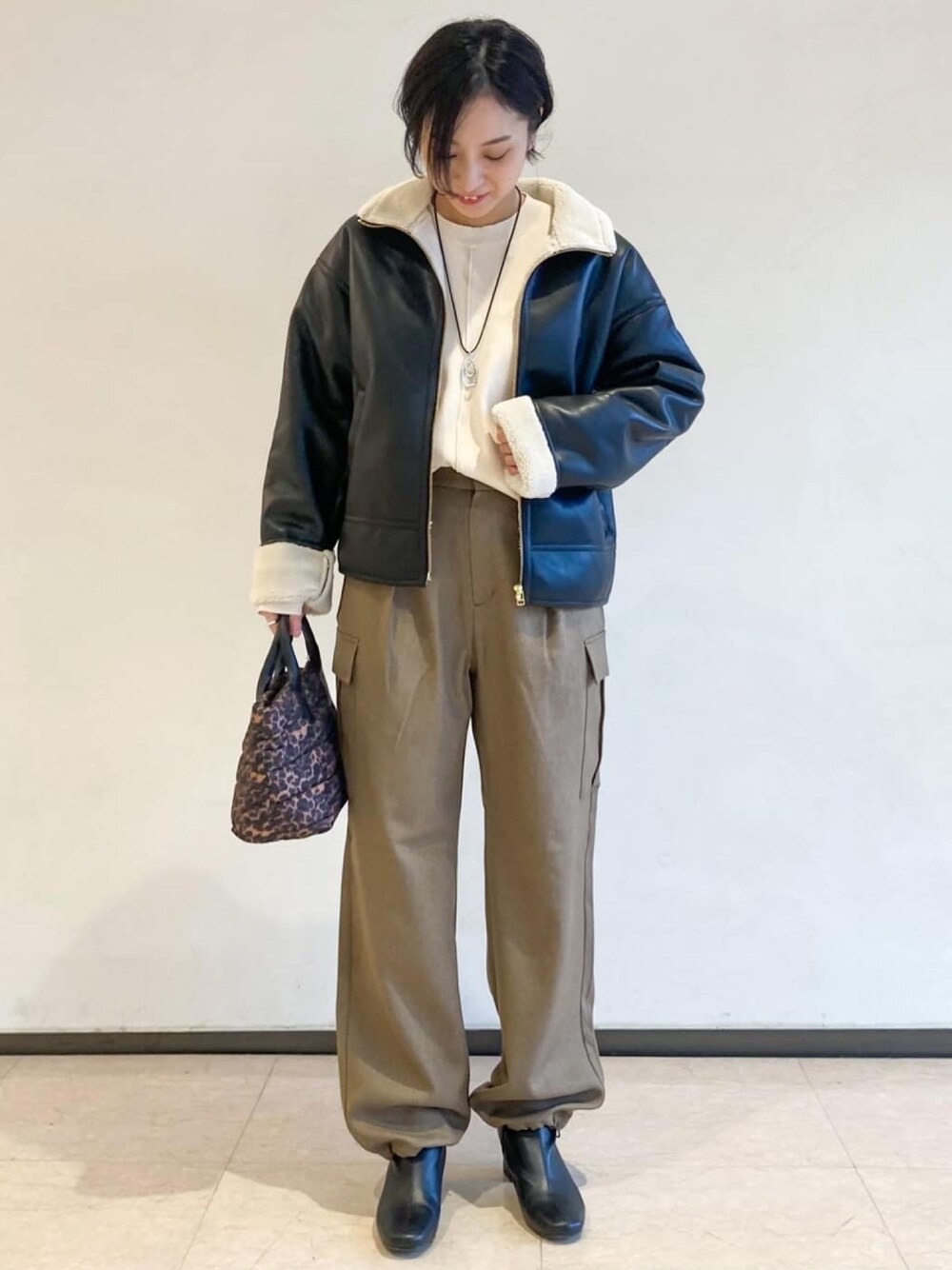 yosi 160cm アウターは裏地がボアになっているため暖かさに驚きました。ゆったりしたサイズ感でインナーも着込みやすく長く着れそうです。 ボアがあることで甘めのワンピースやスカートにも馴染みますし、レザー調なので思いっきりかっこいいテイストにも振れることができ、コーディネートの幅を広げられる1枚です。 カーゴパンツは太ももが気になる方には本当にオススメです。すっきりしたシルエットと柔らかすぎない素材と、なによりポケットの位置が絶妙で細見えが叶います。