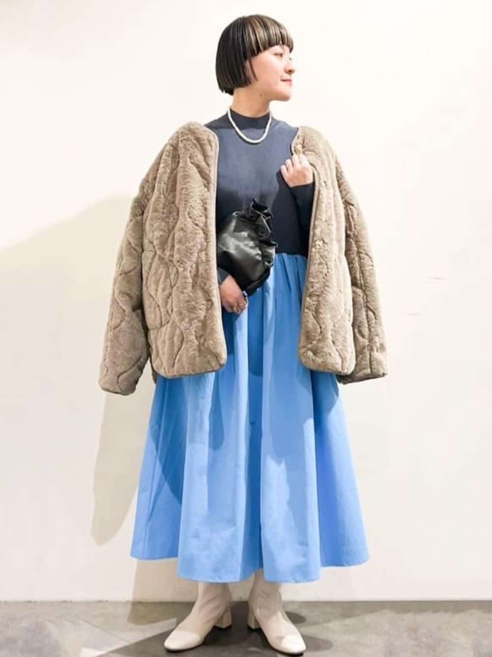 chiaki 156cm 【サイズ感】 ・ワンピース リブニットなので伸縮性抜群でゆとりがあります!ウエストも締め付け弱いです。 ・アウター ボリュームのあるトップスも楽に着れるゆとりがあります! 袖は長めですが、ロールアップするとリバーシブルの裏側が出て可愛いです! 【素材感】 ・ワンピース ニット部分はチクチク感も少なく柔らかいです。スカート生地はハリがありますがかなり軽いです! 【おすすめポイント】 ドッキングには中々珍しいカラーコンビがおすすめです♪ 【スタイリングポイント】 お食事会や年末のパーティーなどにいかがでしょうか^^