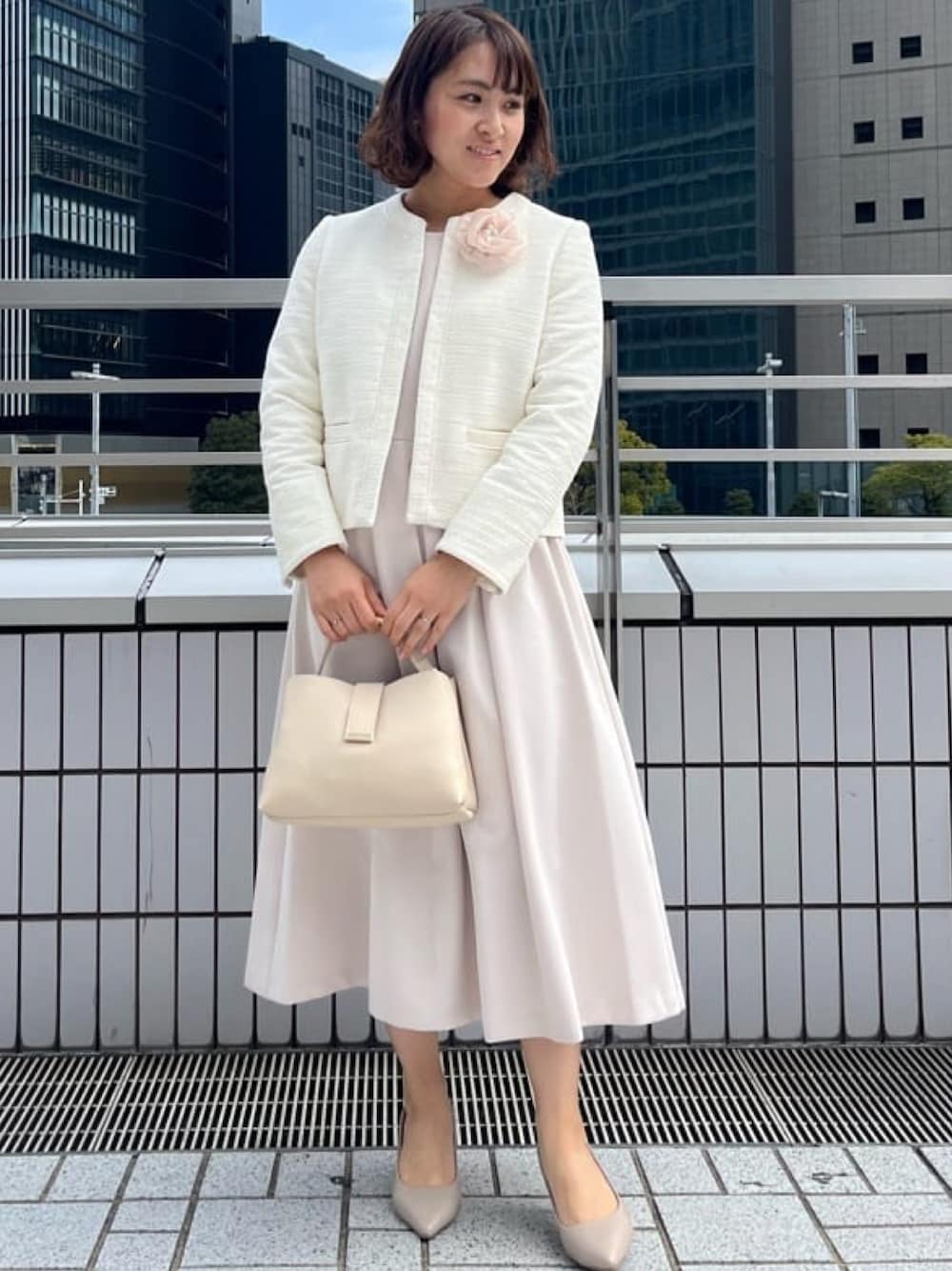 Rika 154cm 卒業式や入学式(卒園式、入園式)にもおすすめのセレモニースタイリングです★ ハレの日のフォーマルスタイリングとして参考にしていただけると嬉しいです! 【サイズ感】 ワンピース、ジャケットMサイズ。 ワンピースは後ろにファスナーがついています。少し大きめでゆとりのあるサイズ感でした。 【素材感・着心地】 ゆとりのあるワンピースは着ていて楽ちんです♪ ジャケットも硬すぎるお素材では無いので着やすかったです! 【おすすめポイント】 可愛すぎるのが苦手な方におすすめなシンプルなデザインです! ワンピースの着丈も十分にあるので背が高い方でも安心の丈感です◎ 【スタイリングポイント】 入園式、入学式におすすめなベージュで統一したスタイリングです! コサージュをブローチに替えても甘くならずおすすめです!ブローチは他の投稿で付けているので、気になる方はぜひご覧下さい★