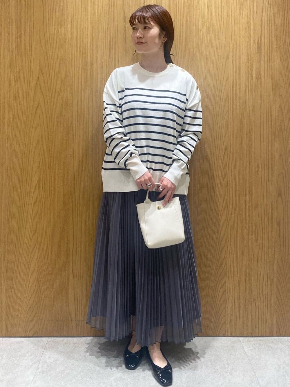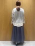 haru 156cm 【サイズ感】 ・ニットはややゆったりめです。 着丈は長すぎず、どんなボトムにも合わせやすいです! ・スカートはややゆったりめです。 着丈も長めで、こなれ感が出せます◎ 【素材感・着心地】 ・ニットはハイゲージでさらっとしていて、長いシーズン着用しやすいです。 チクチク感も気になりませんでした◎ ・スカートは程よいシアー感が華やかで上品な印象に◎ 【おすすめポイント】 ニットは肩ボタンがポイントで、アクセサリーなしでもおしゃれな印象になります♪ 【スタイリングポイント】 カジュアルなボーダーニットにチュールスカートを合わせて、シンプルなお出かけコーデにしました!