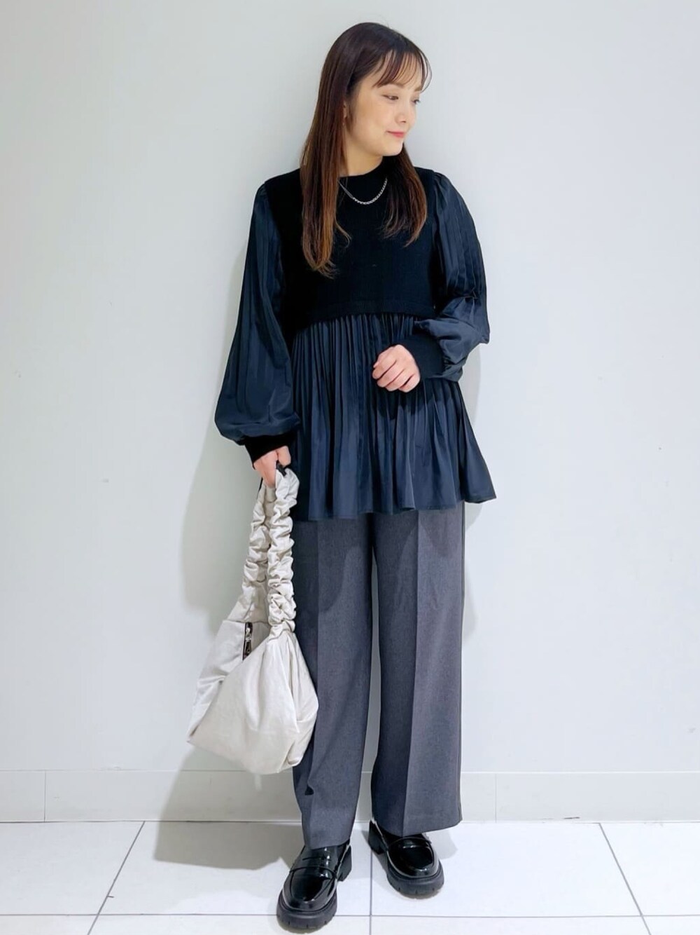 Yuki 156cm 〈トップス〉 ニットとブラウスのドッキングで一枚でサマになります⭐︎ ニット部分は厚手すぎず軽くて柔らかく、とても軽い着心地◎ ヒップが隠れる長さで体型カバーにもなりますよ♪ 〈パンツ〉 総ゴムでヒップ周りにもゆとりがあり、窮屈感なし! ゆとりがありながらもセンタープレス加工で美脚効果もあり、きちんと見えもするのでお仕事にもおすすめです。 身長156センチで、Sサイズでちょうど良い丈感でした。 全体をシックなカラーのアイテムでまとめ、大人ぽさを意識したモノトーンお出かけコーデ♪