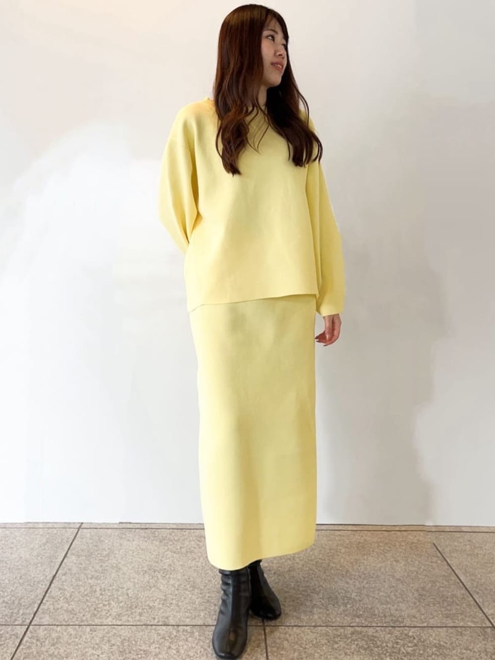 Risa 160cm 【サイズ感】トップス:Mサイズです。ハリ感がりゆったりとするデザインです。普段サイズのワンサイズ小さめを選んでも良さそうです! スカート:Mサイズです。ウエストは少しゆとりがありますがゴムなのでしっかりとまります! 【着心地】トップス:とても軽くて着やすいです。 程よく厚みがあるので春先にも長く着用できます スカート:ウエストゴムになっており伸縮性もあり2wayでスリット付きなので動きやすいです! 光沢感がありストンと落ちるタイトスカートです 【おすすめポイント】上下同素材なのでセットアップで着用もオススメです!コーデを考えずでも 上品に大人っぽく着こなせます! 【スタイリングのポイント】セットアップで合わせてみました♩黄色の上下はあまりないデザインでオシャレ見えです♩別々に違うアイテムでも雰囲気が変わるので一枚あればお仕事や普段でも着回しができます!