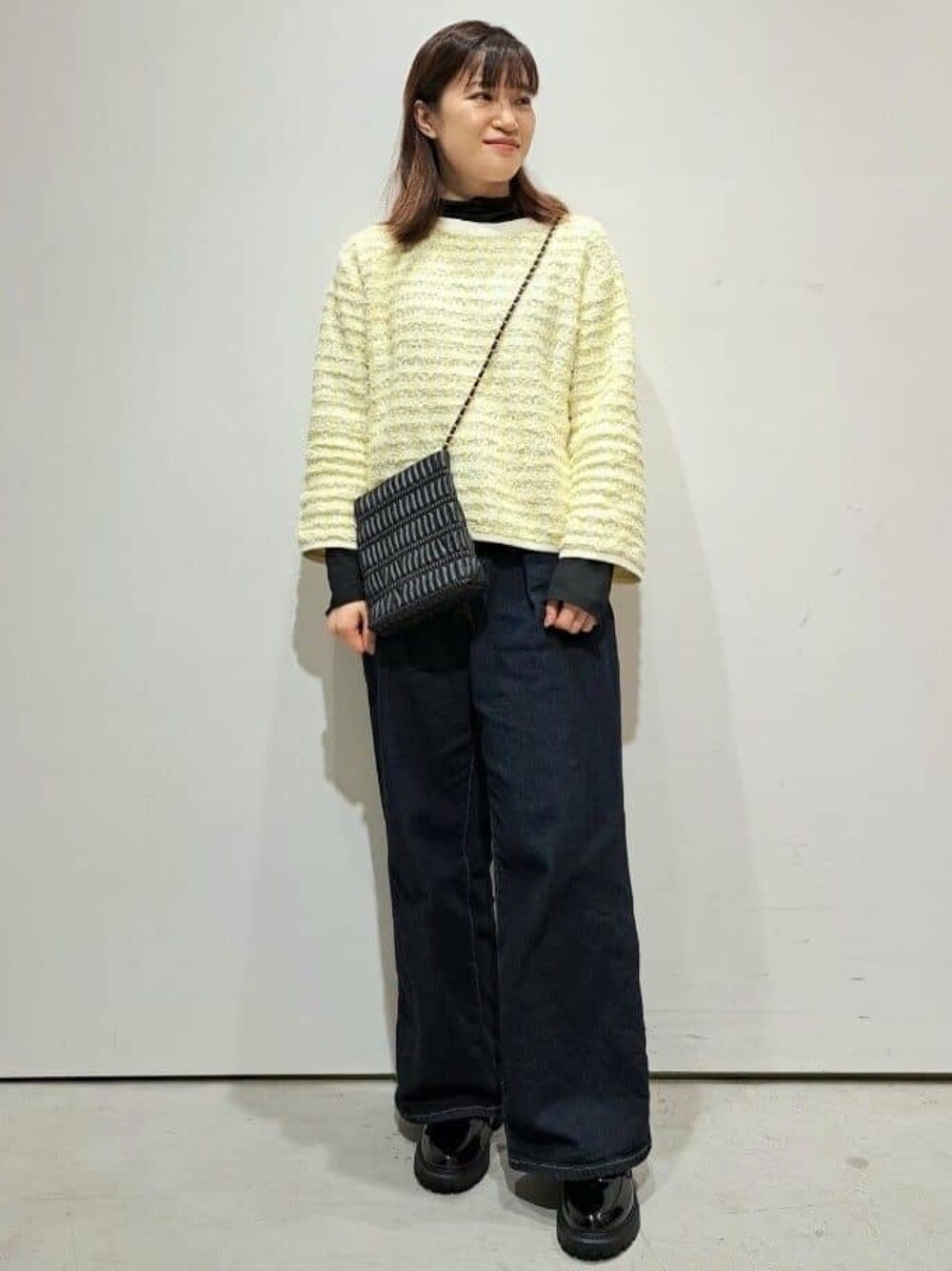 miki 155cm シアートップスを重ねて春らしくしました。黄色のニットは丈短めでスカートでもおすすめです! タック入りのデニムワイドはボリュームを感じさせないスッキリ見えるデザインです。 エナメルローファーはやや厚底でさりげなくスタイルアップに!