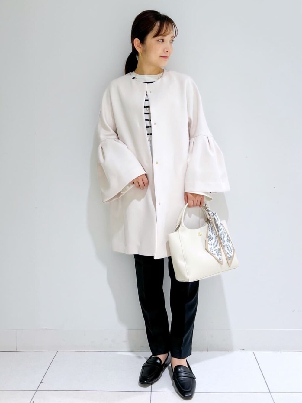 Yuki 156cm ミドルコートはゆとりのあるデザインと柔らかい素材感で、とても軽い着心地でした◎ 袖まわりが大きめなのでトップスも選ばず着ていただけます。 大きめのパフスリーブが可愛らしく、シンプルながら華やかもプラスしてくれますよ♪