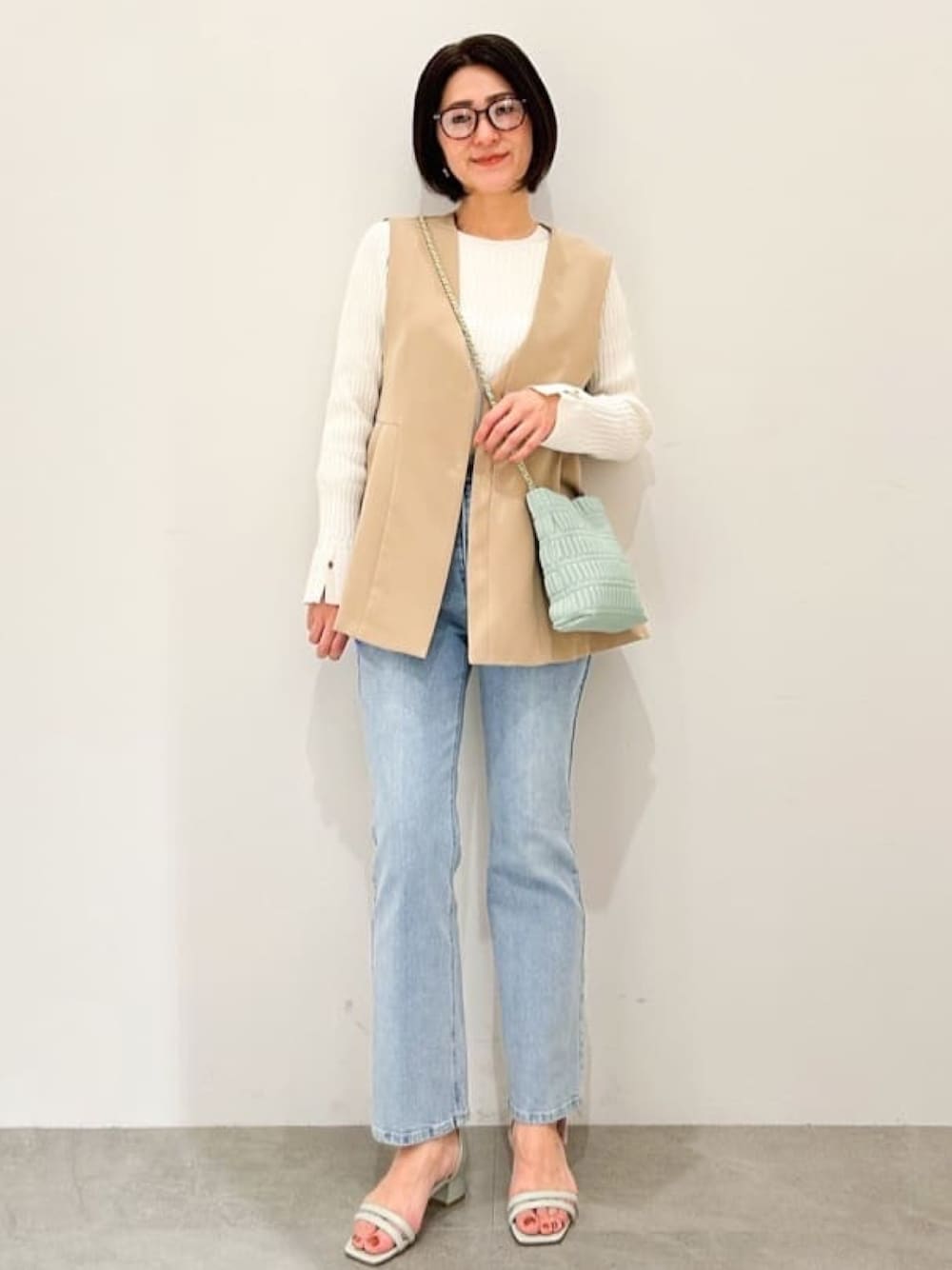 NAKA 161cm 《シルエット》 ジレはペプラムデザイン。 ほどよくウエストが絞られ、高めのウエスト位置なので足長効果も抜群です。 《素材感・着心地》 ジレは、程よく厚みがある素材感ですが、真夏以外は使用できる素材感です。 パンツは定番のストレッチデニムです。 《おすすめポイント》 ジレはセットアップでもお作りがございます。 《スタイリングポイント》 デニムとシンプルなカットソーで大人カジュアルコーディネートにしました。