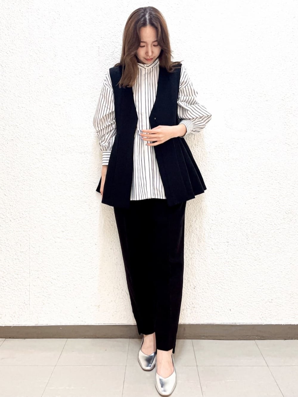 OPAQUE.CLIPスタッフ(OPAQUE.CLIP)のシャツ/ブラウス「◆≪美人百花掲載≫ バンドカラーペプラムシャツブラウス/ストライプ柄アソート【洗濯機洗い可】」を使ったコーディネート