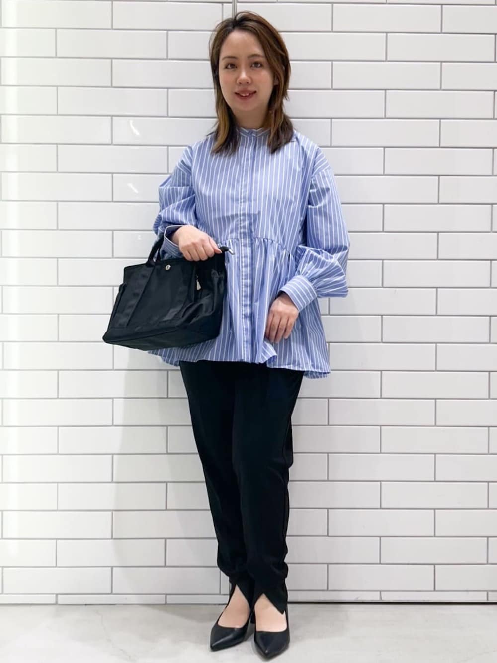 chicchi♪ 152cm 【サイズ感】 ほどよいゆとりあり。 腰回りが隠れる安心丈。 パンツはウエストゴムで楽ちん! 【素材感•着心地】 ブラウス→ 綿/ポリエステル混でハリ感がありきれいな表面感のシャツ素材 シワにもなりにくく、お手入れ簡単な素材 マシンウォッシャブルでご自宅でのお洗濯も可能 パンツ→ 程よい肉感(厚み)のあるポリエステルジョーゼット素材。 伸縮性のある素材で穿き心地も◎ 裾部分には、同色染めのリブ素材を使用。 マシンウオッシャブルでご自宅でのお洗濯も可能。 ※裏地なし 【オススメポイント】 ウエスト切り替えで腰回りカバー。 スタイルアップにも! バンドカラーの比翼仕立てで、すっきりした衿ぐりと前開きデザインでキレイめな印象に。 【スタイリングポイント】 パンツはブラックにしてストライプをポイントに。 キレイめに仕上がりオフィスカジュアルコーデに。 パンツをデニムなどにチェンジして、カジュアル使いも万能なブラウスです♪