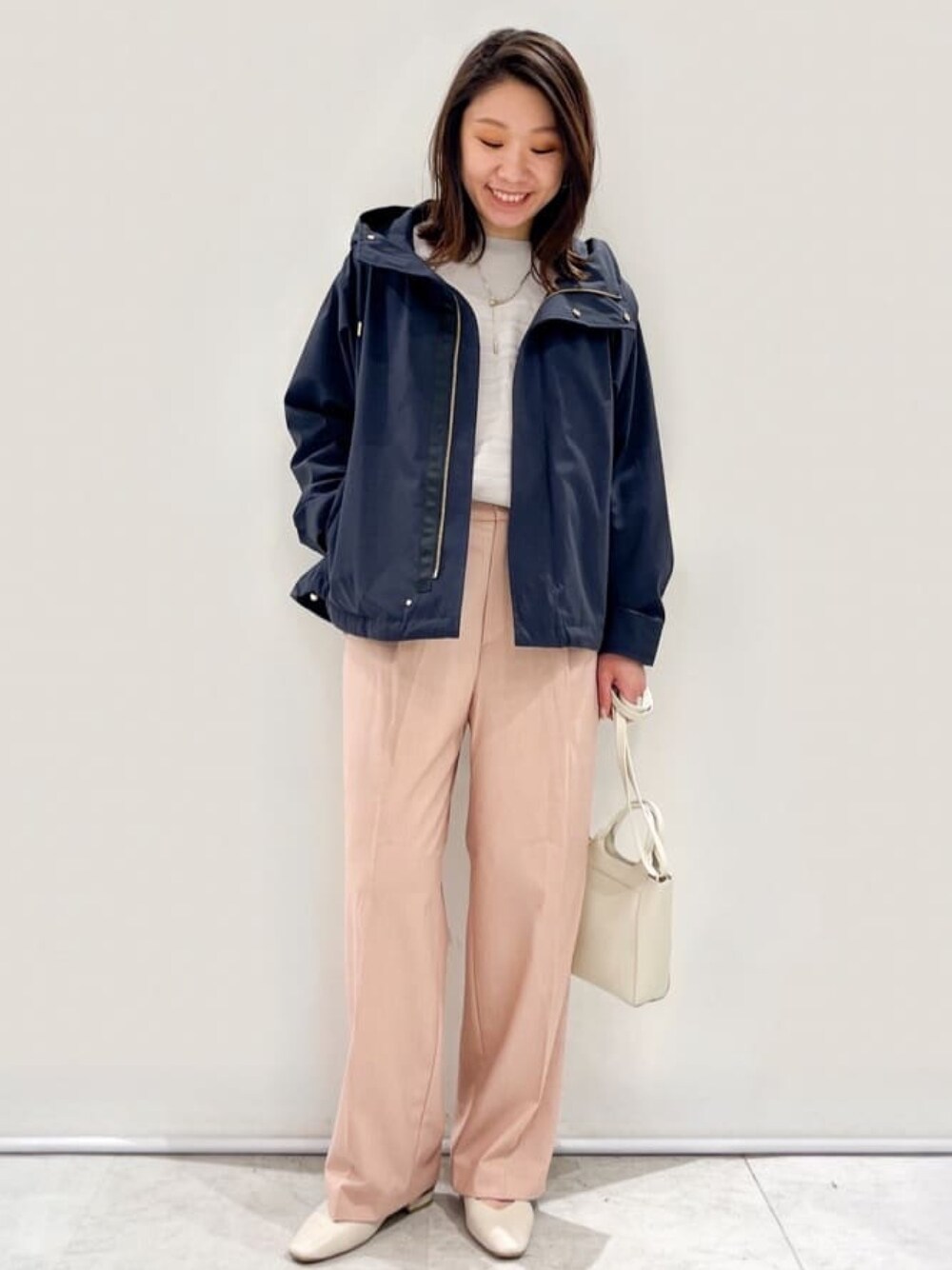 yuka.a 159cm 【サイズ感】 アウター:Mサイズ着用でゆったりサイズでした。 腕周りにも余裕があり、ややAラインシルエットのお作りです。 ニット:Lサイズ着用 S.Mサイズでもゆとりがあるシルエットでしたが、 Lサイズは肩周りなどにもしっかりゆとりが出てリラクシーな印象でした。 ボートネックなので首元が開きすぎることもなく、袖の長さも問題ありませんでした。 パンツ:Mサイズ着用 普段は Sサイズですが、長さが欲しかったので今回はMサイズを着用しました。 ウエスト位置が少し下がるのと、腰回りにゆとりが出ました。 【素材感・着心地】 アウター:ポリエステル・コットン素材でカジュアルに偏り過ぎないキレイな質感のマウンテンパーカーです。 シワになりにくく、マシンウォッシャブル対応・花粉付着防止・撥水加工など、抜群の機能性です^ ^ ニット:エクストラファインオーガニックコットン混の良質なお素材のニットです。 とても柔らかく、肌当たり抜群です。 パンツ:滑らかで落ち感がありキレイな質感です。 ストレッチ性もあり、マシンウォッシャブルやイージーアイロンなどの機能性も◎です! 【おすすめポイント】 アウター:OPAQUE.CLIPのマウンテンパーカーはカジュアルすぎず、キレイめな印象をキープできるので、様々なシーンで活躍間違い無しです^ ^! ご通勤からお出かけ・レジャーまで、合わせるアイテムを選ばない着回し力の高さも◎! また、裾のドローコードを絞ってシルエットの変化もお楽しみ頂けます^ ^ ニット:柄編みでお作りしてあり、表情のあるニットになっています。 開きが広すぎないボートネックでスッキリと、上品見えします。 パンツ:計算された美脚シルエットでどんな方にもキレイに履きこなして頂けるパンツです^ ^! キレイめスタイルはもちろん、大人カジュアルにもぴったりで着回し力も抜群です! 【コーディネートのポイント】 淡色のゆるっとコーディネートにネイビーのマウンテンパーカーを合わせて、メリハリをつけました^ ^