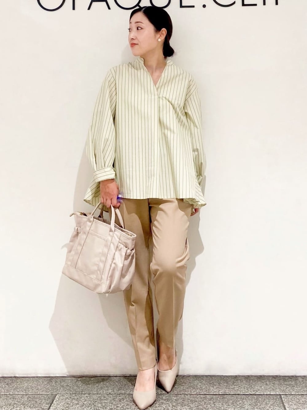 OPAQUE.CLIPスタッフ(OPAQUE.CLIP)のシャツ/ブラウス「◆バックフリルスキッパーシャツブラウス/ストライプ柄アソート【洗濯機洗い可/UVケア】」を使ったコーディネート