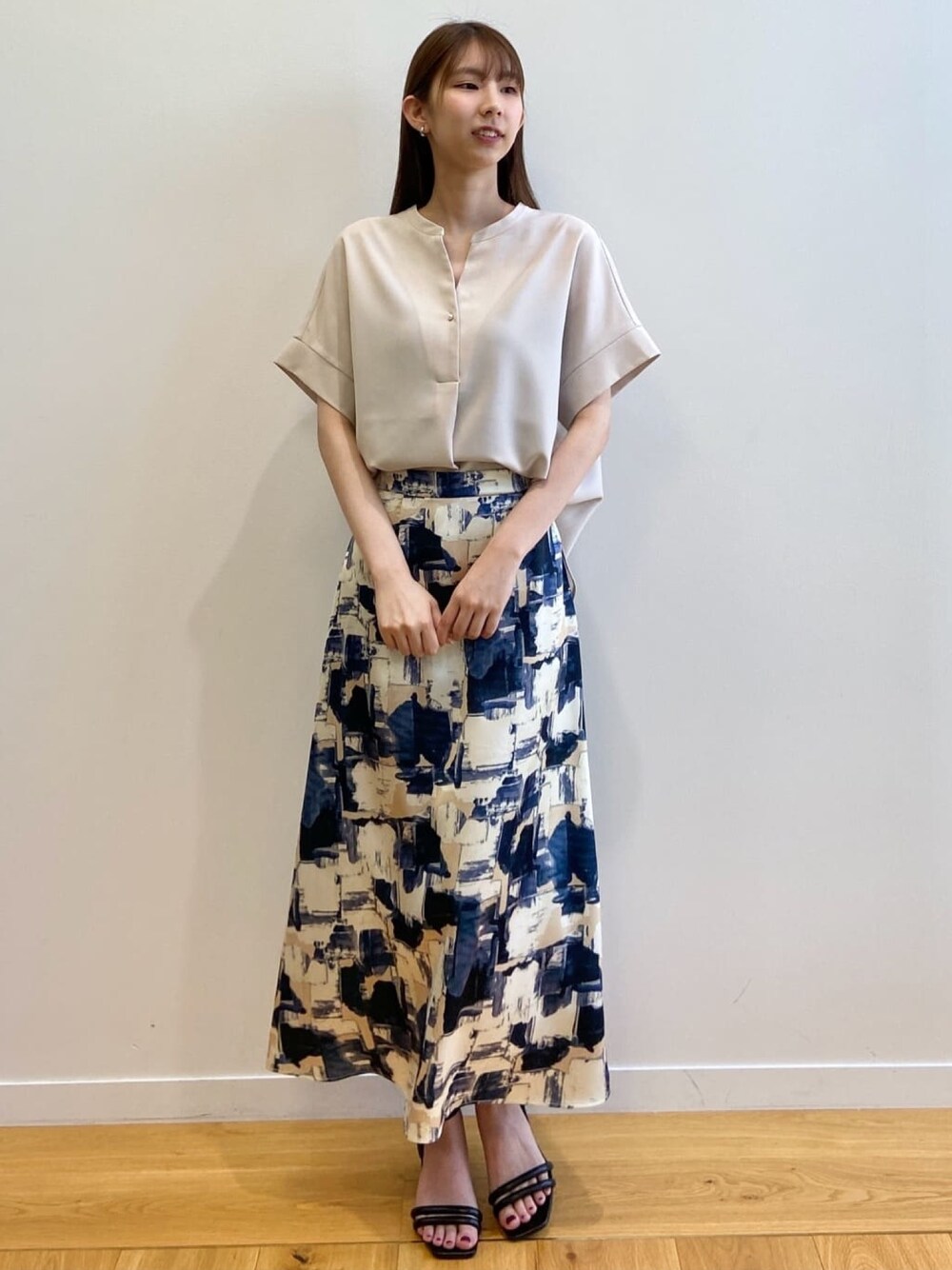 めぐ 166cm 【サイズ感】 Mサイズ着用。 トップスはややゆったり、袖も二の腕を、カバーできてます! 着丈も少し長めなのでパンツスタイルで、アウトにするのもオススメです! スカートは、しっかりと長めで、くるぶしはしっかり出る着丈でした!ウエスト細身体型で少し大きく感じました。 【着心地・素材感】 トップスは、さらっとした素材で防シワ加工がついてます! スカートも落ち感があら、さらっとした素材です! 【オススメポイント】 ブラウスは、セットアップのパンツ(テーパード)(ワイド)のご用意があるので、是非チェックしてみてください! 【スタイリングポイント】 上品な柄スカートを、シンプルなブラウスに合わせてお仕事も華やかにしたい方にオススメなスタイリングになってます!