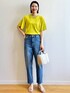 sachiko 174cm 【スタイリングポイント】 イエローカラーがポイント! デニムで合わせた夏のカジュアルスタイルに。 【おすすめポイント】 *トップス シンプルながら袖のデザインが上品見えするニット。 二の腕カバーもしてくれる1枚です! *デニム カーブシルエットのデニムは、 身体のラインを拾いにくいのが嬉しいです! 深めの股上なので、スタイルアップ効果がありながら安心感ある穿き心地が魅力です。 【着心地】 *トップス さらりとした肌触りで気持ちいいです。 適度な落ち感で夏に快適そうです! *デニム ストレッチが効いていて快適な着心地です。 【サイズ感】 *トップス Mサイズで身幅はゆったりシルエット 長さもパンツにもスカートにも合わせやすい丈感でした。 *パンツ Mサイズでウエストはちょうど良かったです。 丈はくるぶしが見える長さでストラップサンダルでバランスをとりました。