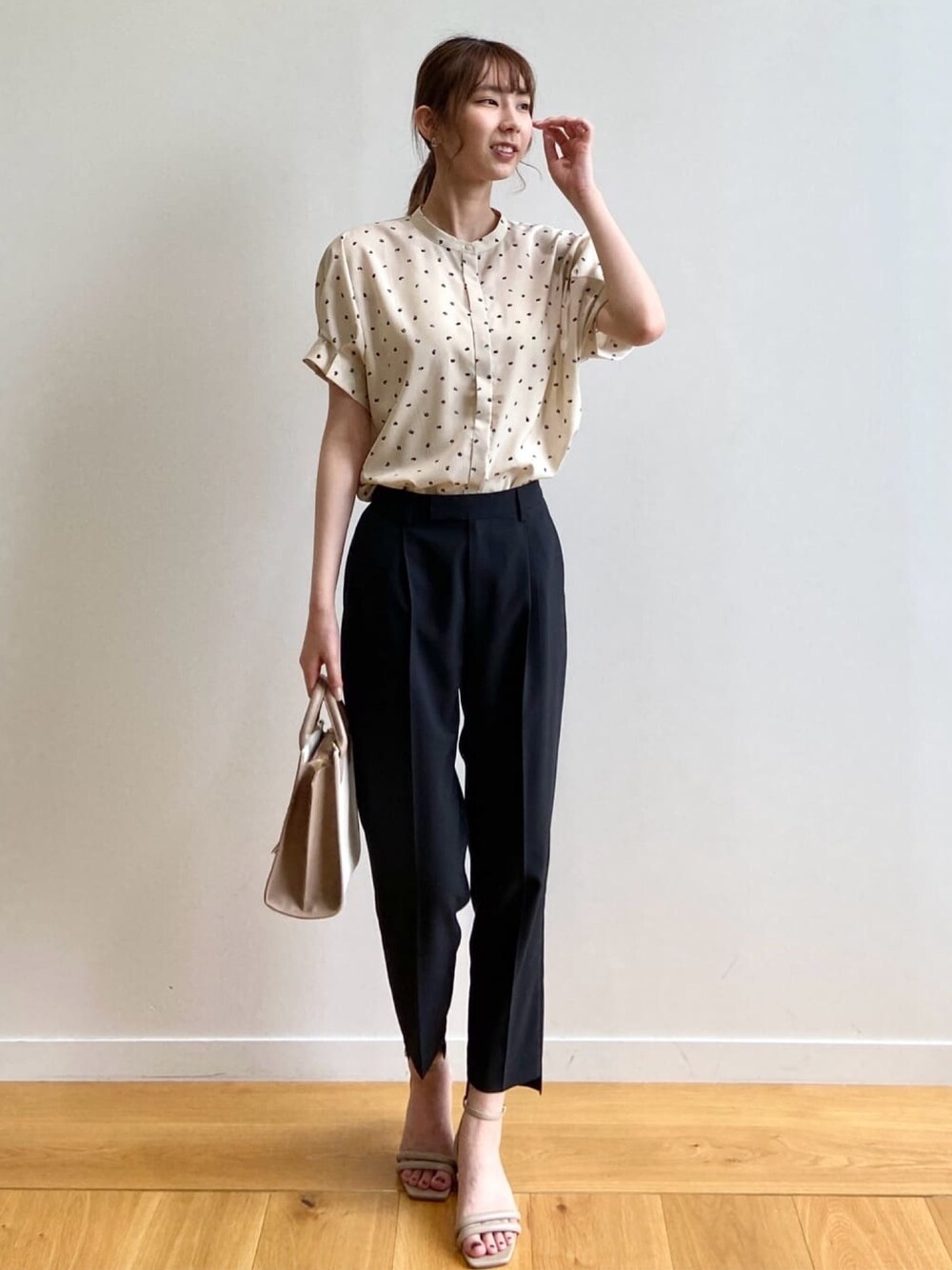 めぐ 166cm 【サイズ感】 Mサイズ着用。 トップスはややゆったりしていて、おしりにかかる着丈でふ! パンツはウエストが少し大きく感じました。 着丈は166センチでちょうどよかったです! 【着心地・素材感】 トップスさらっと落ち感のあるポリエステルの合繊素材で夏にぴったり! 【オススメポイント】 パンツはジレとセットアップがご用意があるので是非チェックしてみてください! 【スタイリングポイント】 お仕事や、学校行事にぴったりなスタイリングです!