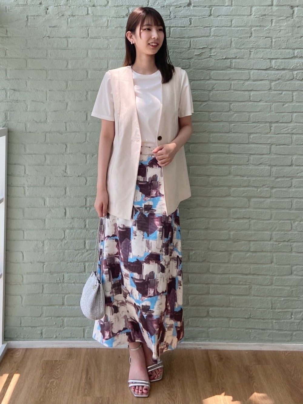 めぐ 166cm 【サイズ感】 Mサイズ着用。 Tシャツは、ピタッとしたサイズ感、ジャストサイズでした! ジレはゆったりしていてお尻が隠れるぐらいでした! スカートのウエストは少し大きく感じました。 着丈は166センチでちょうどよかったです! 【着心地・素材感】 Tシャツはさらっとした素材が夏にぴったりです◎ ジレはしっかりした素材です! スカートもさらっとしている素材で夏でも大丈夫です! 【オススメポイント】 ジレを脱いでも可愛く着回し抜群! 【スタイリングポイント】 シンプルながらトレンドのジレと華やかなスカートで大人可愛いスタイリングにしてます!