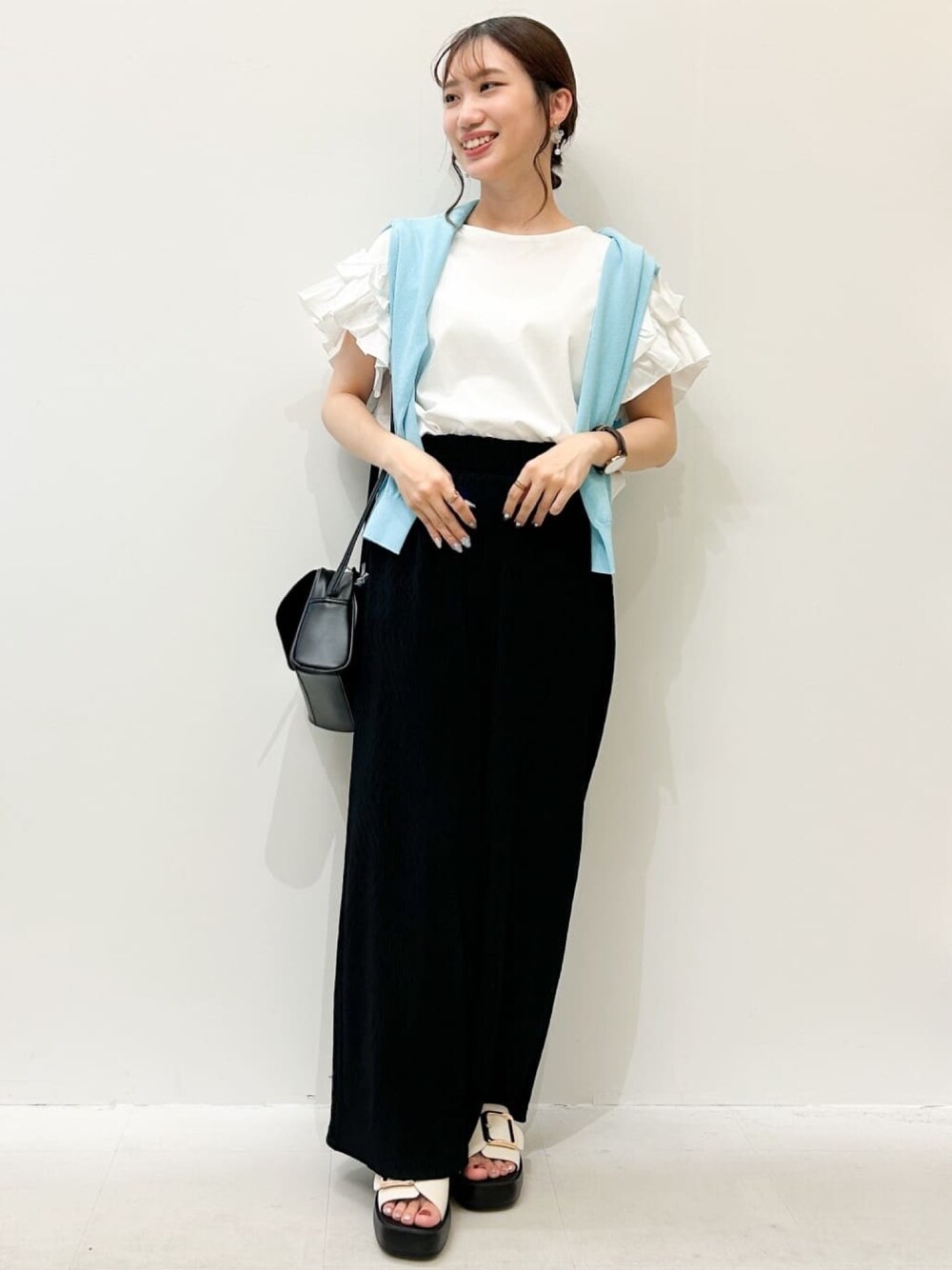 akky 157cm 【サイズ感】 トップス...Mサイズ着用. お袖のフリルデザインがポイントのカットソーです^^ ほどよくゆとりがあるシルエットです! パンツ...Mサイズ着用. ウエストがゴムで楽に穿けるワイドパンツです^^ 【素材感・着心地】 トップス...さらっとしたコットンのジャージ素材です^^ マシンウォッシャブル◎でご自宅でのお洗濯も可能です! パンツ...ストレッチ感のあるジャージ素材です^^ 【オススメポイント】 トップス...お袖のフリルでコーディネートを華やかに☆ パンツ...ウエストがゴムなのでフィット感ありつつ楽に穿いていただけます! 【スタイリングポイント】 夏のお出かけスタイル^^ ブルーのカーディガンを肩にかけて爽やかな印象に♪