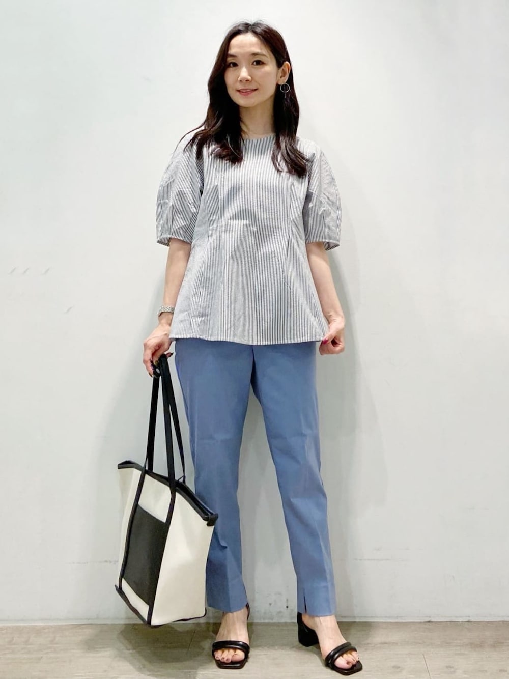 yuicci 156cm 【サイズ感】 ブラウスMサイズ着用。156CM。腰まわりがカバーできる着丈のペプラムブラウスです(^^) パンツSサイズ着用。裾にかけてすっきりした印象で履いていただいただける、テパード美脚パンツです♪ ウエストはほどよくゆとりがあるのでインもしやすいサイズ感です(^^) 【素材感・着心地】 凹凸のある、ふくれジャカード素材のペプラムブラウスなので華やかな印象で着ていただけます♪ 首後ろにボタンがあるので、着脱しやすいです◎ コットンをブレンドしたドライタッチのオックス組織素材のパンツなので、軽やかに履いていただけます(^^) ストレッチ性も効いているので履き心地抜群◎! 【おすすめポイント】 ご家庭の洗濯機でお取り扱いしていただけるマシンウォッシャブルアイテムです(^^) UVケア、接触冷感機能付きの機能性抜群な美脚テーパードパンツです(^^) 【スタイリングポイント】 ペプラムブラウス×ブルーのテーパードパンツを合わせたきれいめカジュアルなスタイリングにしました(^^)