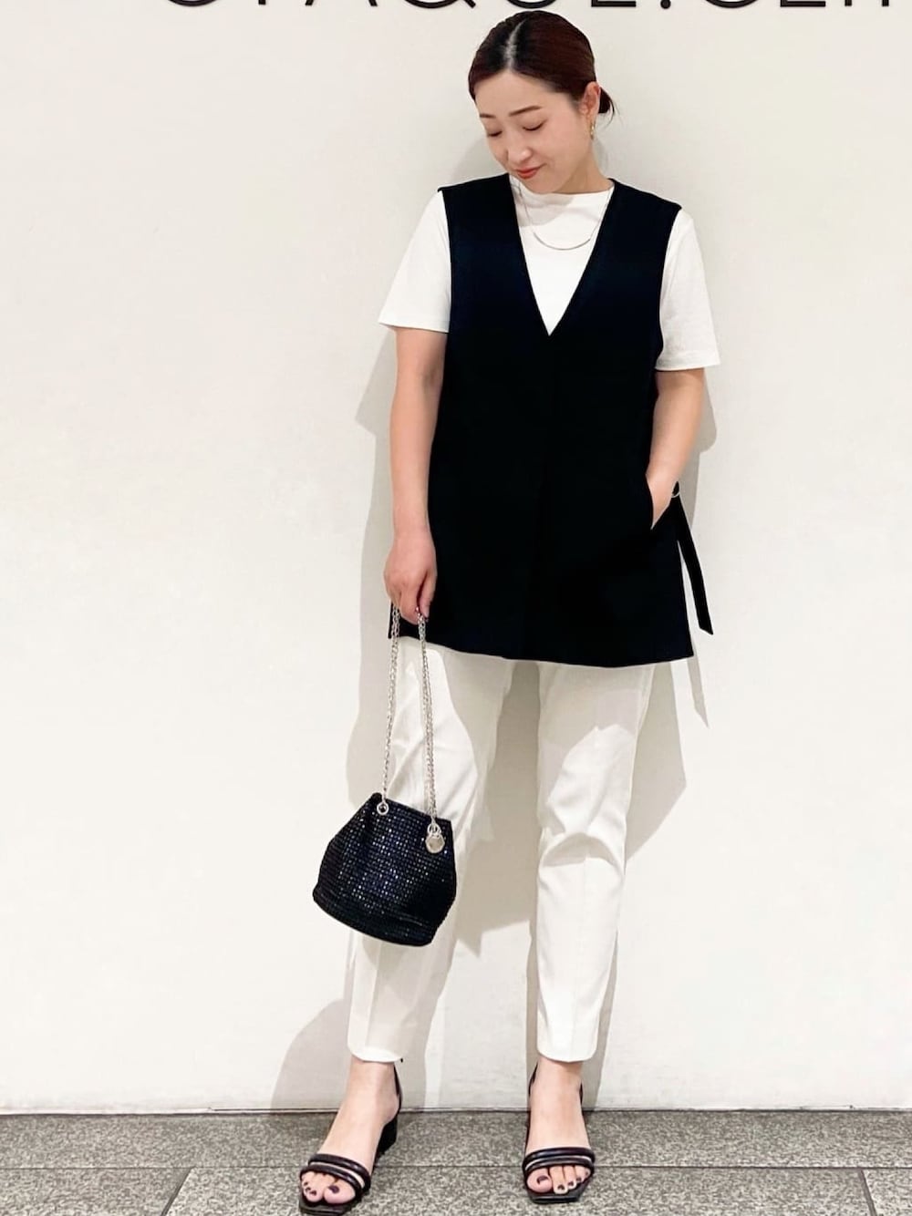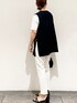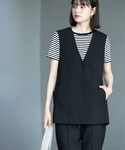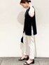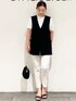 MIHO 154cm ---------------------------------------------- ☆Vネックジレ 着回しコーデ☆ ---------------------------------------------- 《サイズ感》 ジレ…Mサイズ着用で、ゆったりしたおサイズ感です。 裏地が無いので、気温に応じてインナーで調整頂けます♪ お尻も隠れる丈感なので体型カバーも◎ トップス…Mサイズ着用で、サラッとして楽に着れます。 ピタッとし過ぎず程よいサイズ感でした。 お袖はやや長めの半袖丈です。 パンツ…Sサイズ着用でピッタリでした! ストレッチが効いているので少しゆったりめのおサイズ感です。 154センチで丈感もちょうど良かったです。 《素材感・着心地》 ジレ…リネン調のポリエステル素材で、マシンウォッシャブル、アンチピリング、UVケアと機能性◎ 裏地が無いので軽く、サラッと着て頂けます。 ストレッチ性もあり動きやすいです。 ※同素材のテーパードパンツ(637-68030)とセットアップでの着用もできます! トップス…コットン100%でシルクの様な光沢感と滑らかさがあり、着心地抜群です! 接触冷感も付いていて、これからの暑い時期にも快適に着て頂けます♪ クリーンな素材感で普段使いだけで無く、お仕事用のジャケットのインナーにも人気です! パンツ…コットン混のストレッチ素材です。 センタープレス入りで、きれいな美脚シルエットなのでスッキリ着て頂けます! 夏に向けて嬉しい、接触冷感、UVケア機能付きです♪♪ 《おすすめポイント》 サイドスリットとベルトがポイントのジレは、キレイめにもカジュアルにも合わせやすく、着丈も長いので体型カバーにオススメです! シンプルなトップスに合わせて頂くだけでオシャレな着こなしになります♡ 《スタイリングポイント》 夏のモノトーンコーデにしてみました☆ 白の配色を多くすると重たくなり過ぎずにまとまります♪