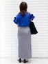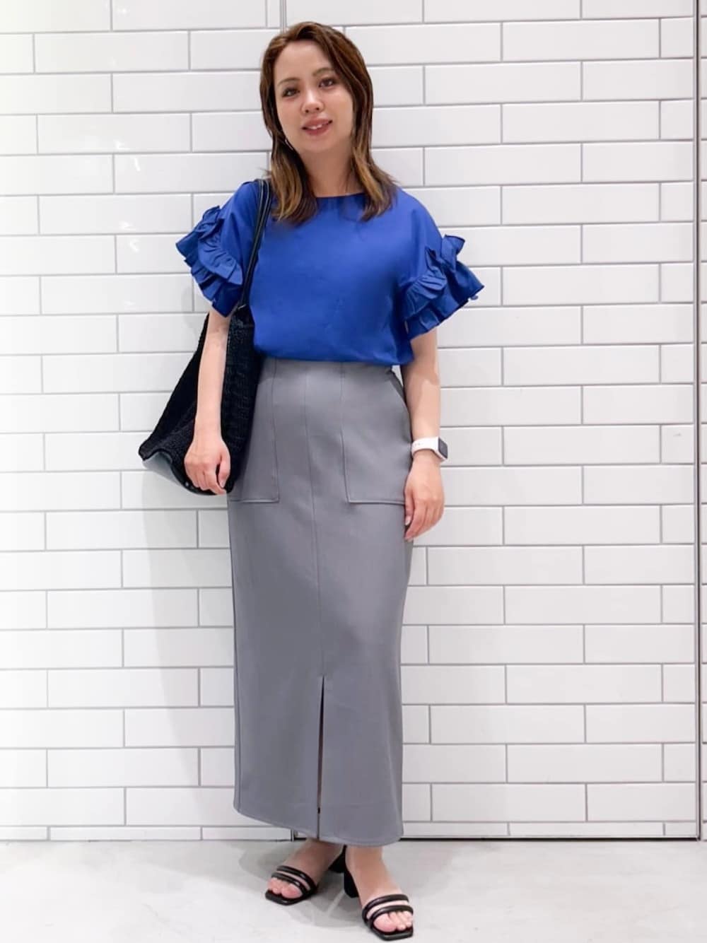 chicchi♪ 152cm 【サイズ感】 ほどよいゆとりあり。 フリル袖が落ちるデザインなので二の腕もカバー◎ バックがゴムで楽に穿いていただけます!動きやすさも抜群!! チャコールグレーはMサイズで着用。腰回りを余裕もたせたい方はLがオススメです! 【素材感•着心地】 カットソー→ 身頃はコットンのジャージ素材を使用し、着心地のいいアイテムです。 マシンウォッシャブルでご自宅でのお洗濯も可能。 スカート→ ドライタッチで梳毛調のポリエステルツイル素材。 ストレッチ性もあり、穿き心地も快適です。 きちんと感がありながら楽に着られる着心地の素材です。 マシンウォッシャブルでご自宅でのお洗濯も可能。 ※膝丈の裏地あり 【オススメポイント】 カットソー→ フリルは大きすぎず、華やかながら大人に着こなせるデザイン。 二段フリルのうち、上段をランダムに留めることで、抜け感のある印象に仕上げています。 お袖が二の腕にかかり、自然にカバーしてくれるデザインです スカート→ すっきりとしたバランスで穿ける、Iラインのシンプルなタイトスカート♪ フロントやポケット部分に入ったステッチデザインがアクセントに! 細見えが叶うウエストデザインながら、バックはゴム仕様で楽に着て頂けます。 フロント裾スリットで、足さばきも快適です。 ※ポケット数:横×2 ※左脇ファスナー 【スタイリングポイント】 オフィスカジュアルにも使えるコーデに。 ベーシックカラーでお仕事にも◎ ブラックのバックとサンダルでキリッとしまり 統一感出てオススメです。 低身長さんでも全体的なバランスがキレイなスカートです♪