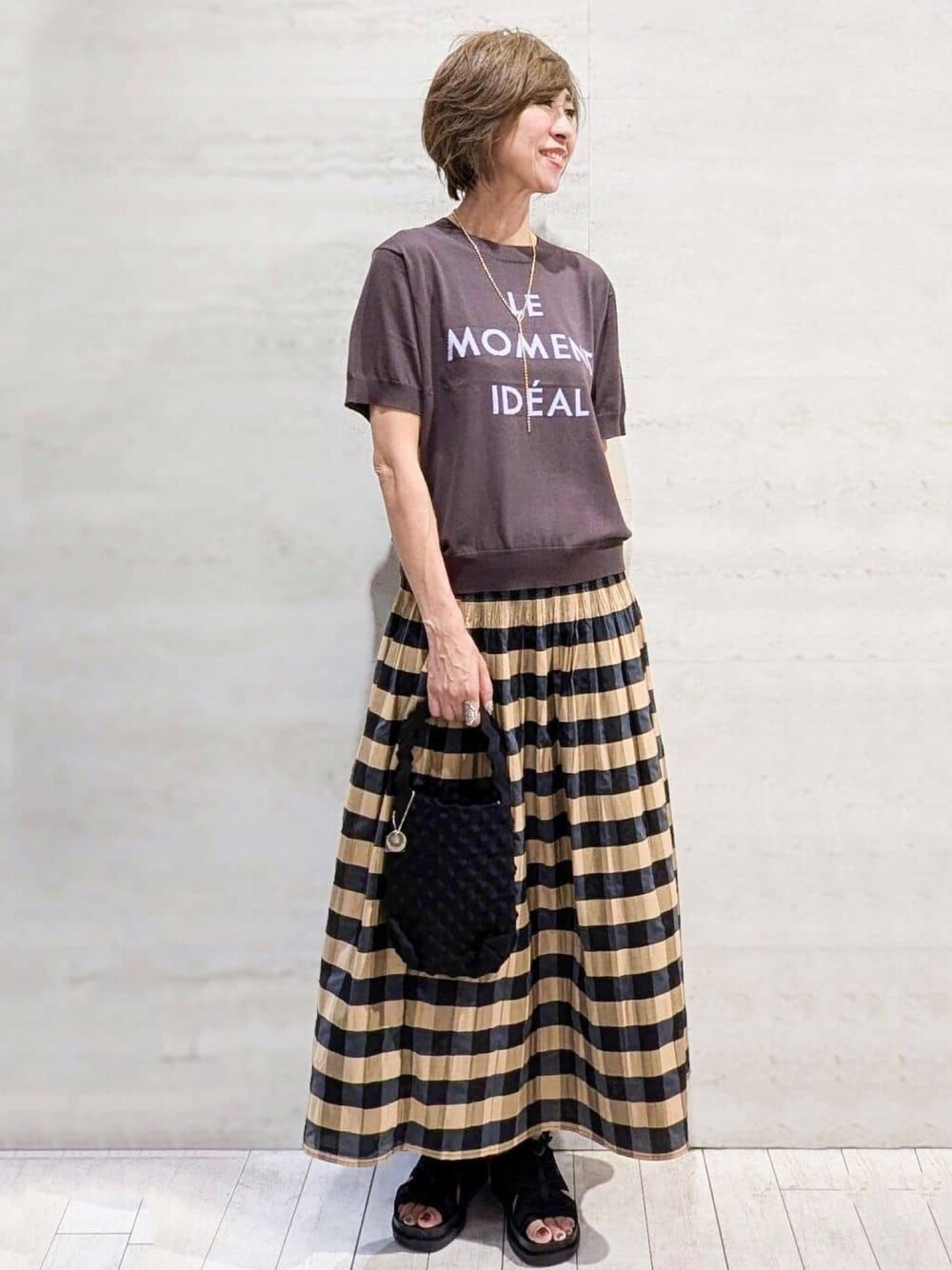 kemy 165cm 【サイズ感】 Ꮇサイズ着用 ゆとりもありジャストサイズ 【素材感・着心地】 ニットはサラッとして着心地抜群◎ スカートはウエスト部分がワッシャープリーツ加工で柔らかく着心地抜群! 【おすすめポイント】 美人百花掲載のロゴジャカードニット。 洗濯機洗い可でUVケア効果もあり、ピリングも抑えられます。 リバーシブルのチェック/ストライプフレアスカートもおすすめ。 2つの柄で着用できるフレアスカートは、ウエストからのワッシャープリーツ加工が特徴です。 トレンドのポコポコニットバッグは、凹凸感のある素材を用いたシンプルなデザインで、持ち方のアレンジも自在です。 スタイリッシュなボールチェーンラリエットネックレスは、ボールチェーンの位置を変えることで様々なデザインが楽しめます 【スタイリングのポイント】 カジュアルスタイルにコーディネート ロゴニットとチェック柄のスカートでカジュアルに…カラーは、秋にも使えるブラウン系にまとめてみました!