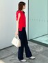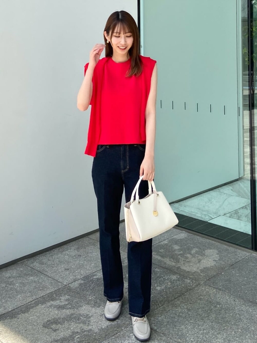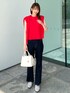 めぐ 166cm 【サイズ感】 Mサイズ着用。 トップスは、スッキリ着用できるフレンチスリーブニット!ややゆったりしたシルエットです! ボトムは細身体型で、少しウエストが大きく感じました。 【着心地・素材感】 さらっとしたタッチがポイントでお手入れ簡単です! デニムはストレッチが効いていて履きやすいです! 【オススメポイント】 カーディガンとトップスは、アンサンブルなので一緒に着用でオシャレになります! 【スタイリングポイント】 赤がポイントの素敵なスタイリングです♪