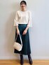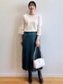 sachiko 174cm 【スタイリングポイント】 ホワイト×グリーンの秋カラーを意識した コーディネートに。 毎年大人気のスカートは新色のグリーンカラーが新鮮!深めのグリーンなので合わせやすいです。 【おすすめポイント】 *ニット 袖のシアーボーダー切り替えのデザインがポイント。 1枚でおしゃれ見えが叶うニットです! *スカート スウェード素材で秋冬に大活躍! 落ち感のあるサラッとした素材が高見え間違いなしの1枚。 もちろん履き心地も抜群で重宝します。 【着心地】 *ニット 伸び感のあるニットで着やすかったです! *スカート 締め付け感なく快適な穿き心地です。 ウエスト部分がゴムになっているのでインもしやすく、動きやすいです。 【サイズ感】 *ニット Mサイズで少し余裕のあるサイズ感。 肩幅が広めな私でMサイズでちょうど良かったです。 *スカート Mサイズで膝がしっかりと隠れる長めの丈感。 秋冬のブーツ合わせも素敵です!