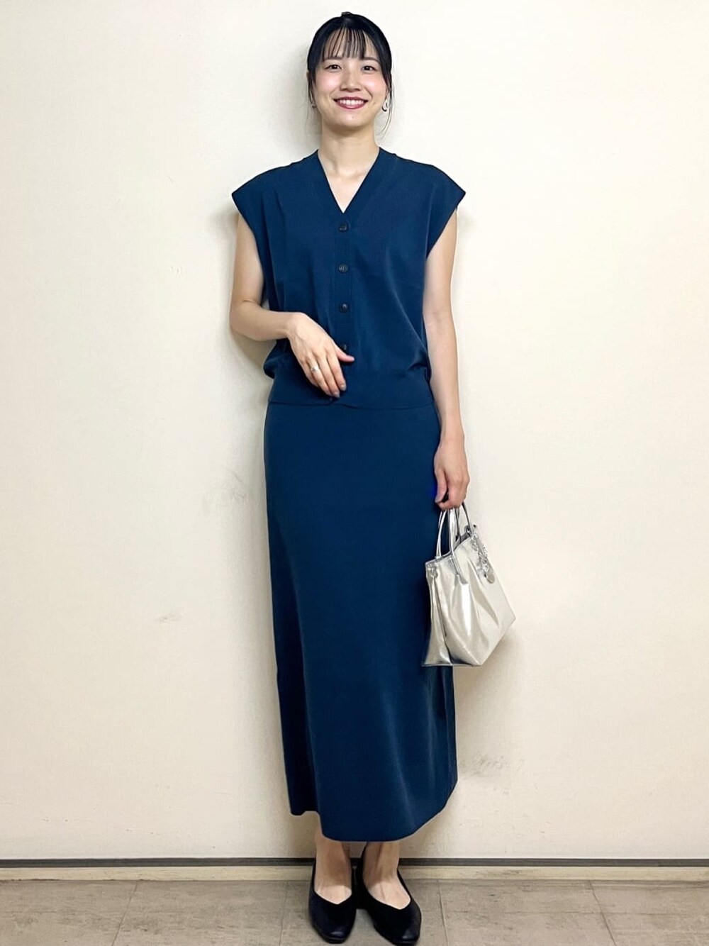 sachiko 174cm 【スタイリングポイント】 ベスト×ナロースカートのセットアップスタイル。 ブルーカラーが大人っぽく、秋口まで活躍! シルバーバッグでアクセントをプラスしました! 【おすすめポイント】 *ベスト トップス風に着用や、レイヤードスタイルにもピッタリ! 通勤シーンからお出かけまで幅広いシーンで活躍します。 *スカート 楽ちんながらストンと落ちたナローシルエットが大人っぽさプラス。 長めの丈感が今年っぽいスタイリングに◎ 【着心地】 *ベスト 程よいゆとりがあり締め付け感なく着用できました。 *スカート ぐるりゴムで伸びのいいニット素材なので 快適な穿き心地でした。 【サイズ感】 *ベスト Lサイズで程よいゆとりのあるサイズ感でした。 *スカート Lサイズでウエストはやや余裕がありました。 長さも十分にあり、高身長の私でもバランスよく着用できました。