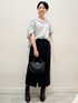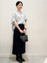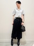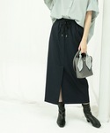 yurie 167cm 【サイズ感】 ブラウス・Mサイズ着用。ドルマンシルエットでゆったりしているのでラインを拾わず体型カバーが叶います!お袖も二の腕が隠れる長さです! スカート・Mサイズ着用。ウエストはゴム仕様で楽ちんですが紐で絞れるので緩すぎることも無く着られます!167cmでふくらはぎが隠れるぐらいの丈感でした! 【素材感•着心地】 ブラウス・サラッとした軽やかな着心地です!シワになりにくいお素材なのでお手入れ楽ちんです! スカート・伸縮性もあり動きやすいです!深めの前スリットなので歩きやすく動きやすいです! 【オススメポイント】 スカートはマニッシュな素材感でカッコよく着られるのがポイントです! 【スタイリングポイント】 ドルマンシルエットのブラウスにタイトスカートを合わせたキレイめマニッシュスタイリングです!トップスがゆるっとしたシルエットなのでスッキリとしたタイトスカートを合わせてバランス良くきちんと感もプラスしています!前を少しだけタックインする事でウエストスッキリ見えと脚長効果抜群です◎