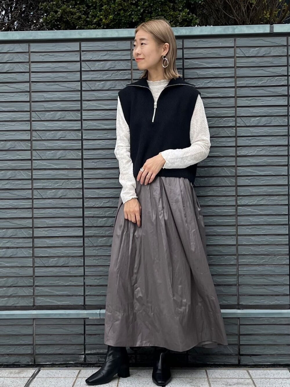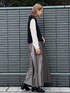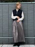 NAMI 161cm 【スタイリングポイント】 ハーフジップデザインがトレンド感あるニットベストスタイル。レザーライクな素材のフレアスカートと合わせてモードMIXに! 【おすすめポイント】 ベストは腕周りをさり気なくカバーしてくれるちょいゆるシルエットも嬉しいポイント。 【サイズ感】 ベストは38(M)サイズ着用で身幅のゆとりがありました。 スカートは36(S)サイズ着用で私の身長だとくるぶしくらいの着丈でした。 【素材感・着心地】 ベストはふっくら編み目の温かみがある秋らしい風合いのミドルゲージニット。 スカートはチンツ加工を施した、レザー見えの合繊素材。どちらもマシンウォッシャブル可能です。