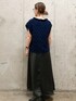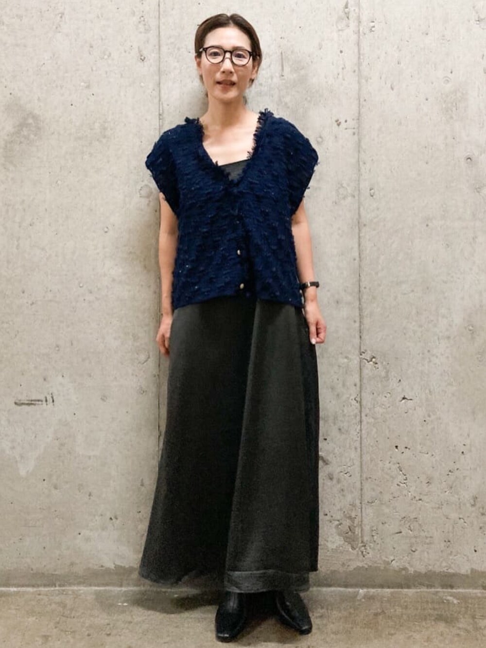 T 163cm 【サイズ感】ベストM、ワンピースMサイズ着用, ベストは短丈のストンとした身ごろでゆとりがあります。 ワンピースは肩紐で長さが調整でき、ゆったりしたサイズです。 【着心地、素材感】ベストはボリュームあるツィード風な生地で、編み模様があります。 ワンピースは光沢感があり落ち感のあるツルッとした生地です.裏地もあります。 【おすすめポイント】ニットベストは合わせると一気に季節感が増します! 【コーディネートポイント】異素材のダークカラーコーディネートです。エレガントなシルエットのワンピースをカジュアルに着回してみました。