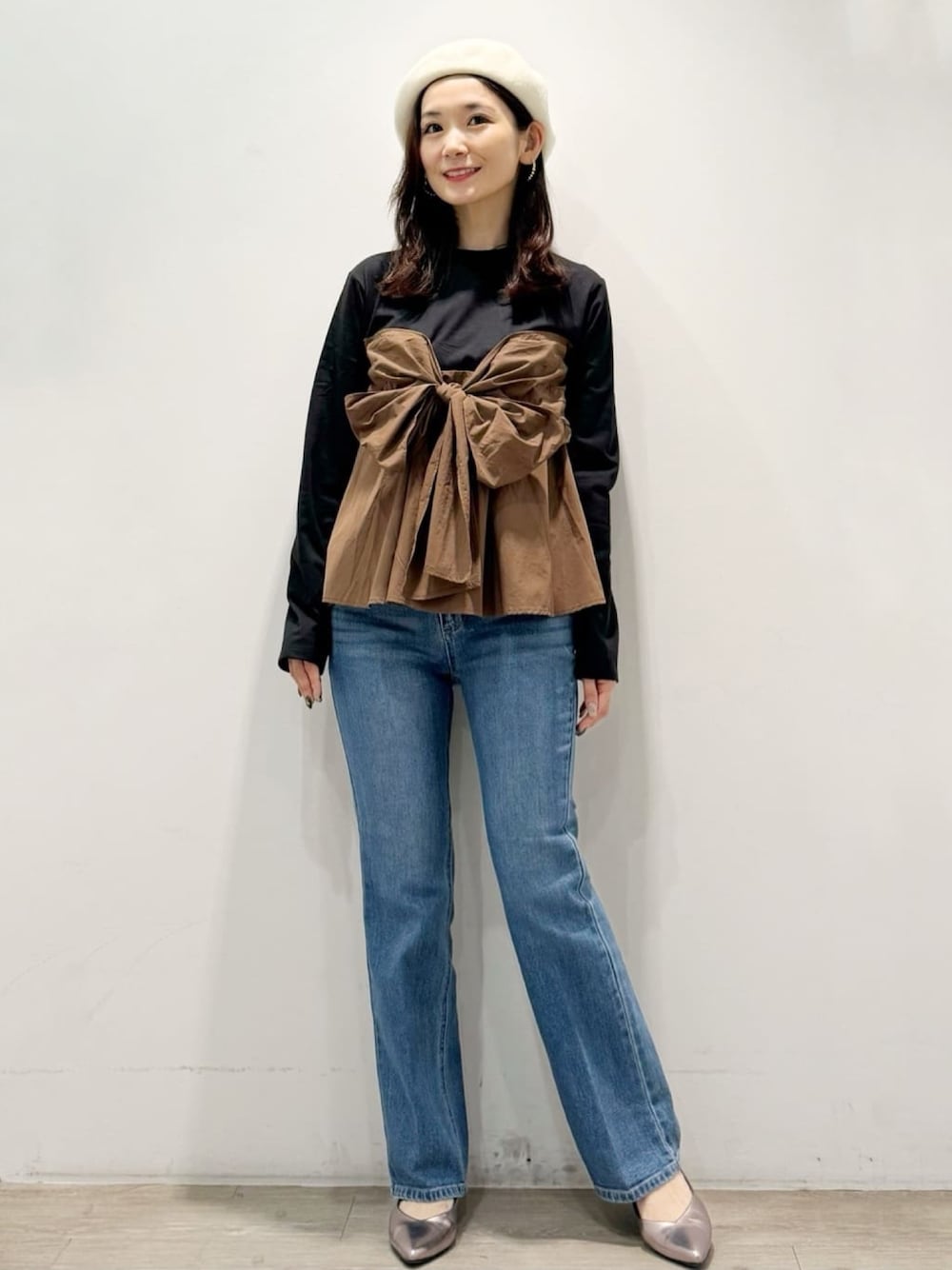 yuicci 156cm 【サイズ感】 トップスMサイズ着用。二の腕もカバーができ、腰まわりがカバーができる着丈です(^^) デニムSサイズ着用。センタープレスが入っているので、美脚効果でシルエット綺麗です♪ 156CM。ジャストサイズのウエストと丈感でした(^^) 【素材感・着心地】 肌触りが良く、着心地快適に着ていただけるトップスです(^^) リボン部分ははり感があります♪ キレイめにこなしやすい加工感・原料にオーガニックコットンの素材のデニムです♪ ストレッチ性抜群なので、履き心地快適です(^^) 【おすすめポイント】 1枚で着映えするドッキングリボンのトップスです(^^) ご家庭の洗濯機でお取り扱いしていただけるマシンウォッシャブルアイテムです♪ 【スタイリングポイント】 ドッキングリボンのトップス×セミフレアデニムを合わせた大人カジュアルなスタイリングにしました(^^)