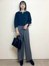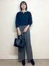sachiko 174cm 【スタイリングポイント】 ネイビー×グレーで合わせた 綺麗目通勤スタイル。 トップスのパールボタンがさりげなく華やかさをプラス! 【おすすめポイント】 *トップス ブラウスのように着られるジャージ素材トップス。通勤シーンに大活躍します! ゆとりのあるシルエットがこなれ見え。 袖口の金ボタンもさりげないポイントです! *パンツ 美脚見えしつつ、穿き心地快適なワイドパンツ。 グレーカラーが秋冬に合わせやすいです◎ センタープレスで脚長効果も期待! ウエストがゴムになっているので安心感があります◎ 【着心地】 *トップス ストレッチ感が効いた素材なので非常に快適な着心地です! *パンツ ストレッチが効いていて、なおかつ ウエストがぐるりゴムで楽ちんです! 【サイズ感】 *トップス Mサイズでゆとりのあるサイズ感です。 後ろが長めのデザインでヒップにかかるので、腰回りを自然とカバーしてくれます。 袖はすっきり7分袖で秋に活躍します! *パンツ Lサイズでウエストは余裕があり、 ゴムで調整しました! くるぶしに少しかかる丈感です。