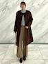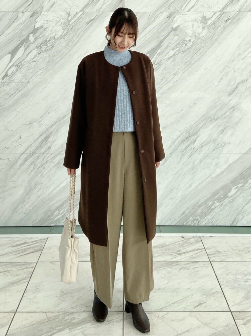 めぐ 166cm 【サイズ感】 アウターはノーカラーがスッキリしたシルエットに!身幅はゆったりしてます! ニットはゆったりしていて、体のラインは拾わないです!着丈短めでスッキリしてます。 パンツは少しウエスト大きく感じました。 【着心地・素材感】 アウターはウール調のジャージ素材で軽くて楽ちん。、 ニットは柔らかい肌触りで、着心地いいです! パンツは程よい落ち感のある素材。 【オススメポイント】 ウールライクなコートは綺麗見えする事間違いなし!シーンを問わず着用頂けます! 【スタイリングポイント】 短丈ニットとワイドパンツで、シンプルながらにスタイルアップコーデ!