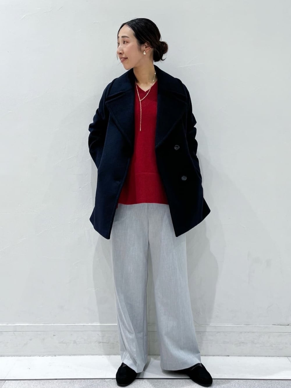 ちえ 167cm 《サイズ感》 ◯コート◯ 全体的にゆとりのあるサイズで袖にもゆとりがあるので、インナーを選ばずに着やすいサイズ感です!長さも腰が隠れる安心の着丈です! ◯トップス◯ ゆとりのあるデザインでリラックス感があるので着やすいです。前後差のあるデザインでおしりが隠れる安心の長さです。首元のVネックも深過ぎず、1枚でもレイヤードスタイルにも着回しがきくデザインです! ◯ボトムス◯ ウエストが総ゴムでとても履きやすいです。ワイドストレートのデザインなので、足のラインをひろわず安心感があります! 《素材、着心地》 ◯コート◯ カシミア混の滑らかな柔らかい素材です。ウール素材なので暖かいです! ◯トップス◯ ウール混の柔らかい肌触りで着心地がいいです。ご自宅でお洗濯可能で、安心して着回していただけます! ◯ボトムス◯ 起毛感のある合繊素材で暖かみのある素材です。ストレッチも入った柔らかい肌触りで着心地がとても良いです! 《オススメポイント》 ◯コート◯ ベーシックなPコートなのでトレンドに左右されにくく長く着ていただけます。 ミドル丈なのでボトムを選ばずに着やすいです! ◯トップス◯ ベーシックで使い回しのきく1枚です。ぱっと目を引く赤色がこれからのシーズンに華やかで、カジュアルスタイルのポイントにもオススメのニットです! ◯ボトムス◯ ベーシックでリラックス感のある、オペークドットクリップで人気のパンツです!ワイドシルエットなので足のラインを気にせずとても履きやすくオススメです! 《スタイリングポイント》 定番アイテムで組み合わせたリラックス感のあるカジュアルスタイルです!ゆとりのあるサイズ感でベーシックになり過ぎないようにコーディネートしました!