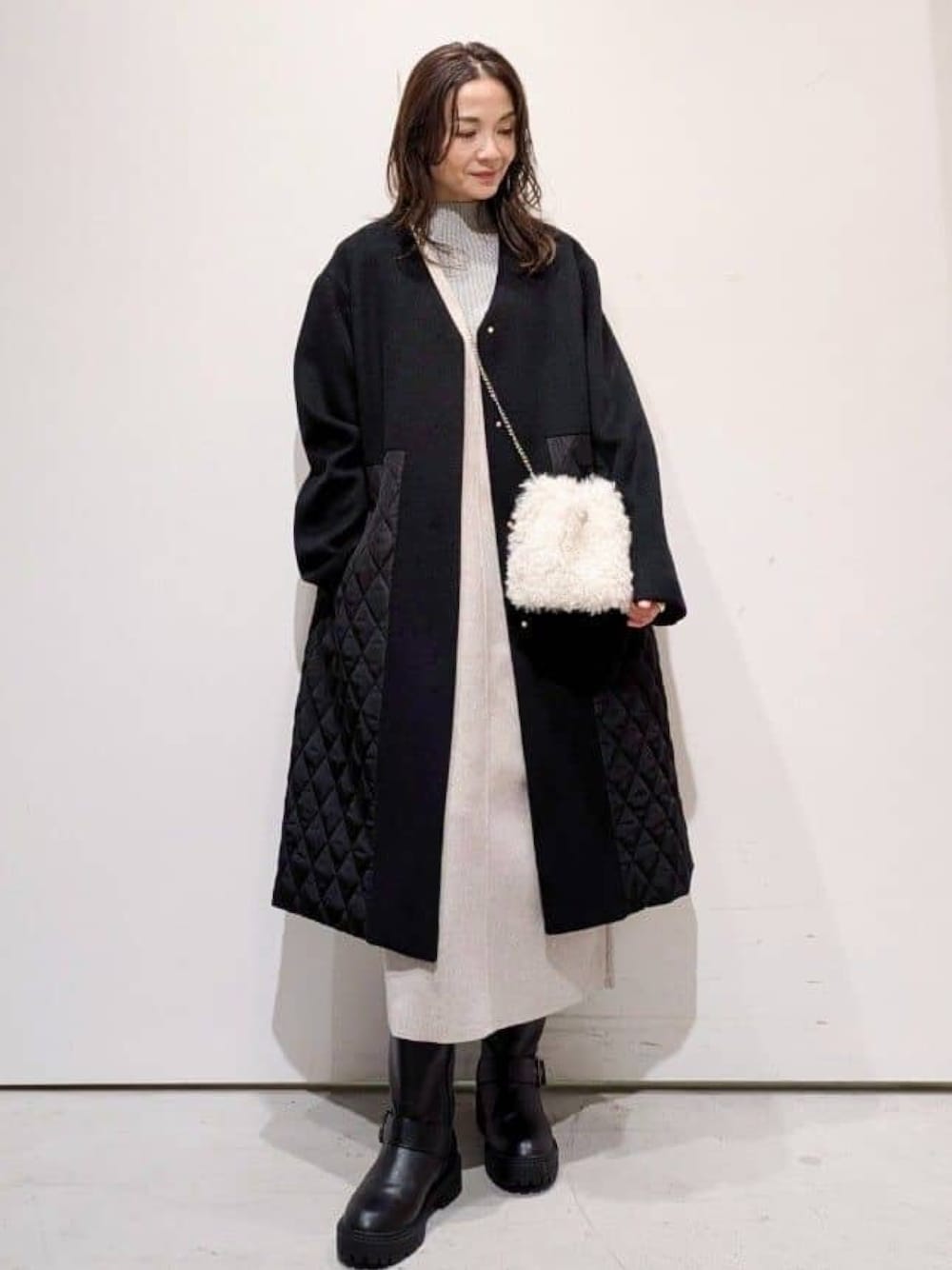 machi 157cm キルティングをドッキングさせたコートのご紹介です! 【サイズ感】 身長157cm コート、ワンピース、ニット、Мサイズ着用 ▷コート 膝下10センチくらいの着丈になりました。 身頃はゆとりがあります。 袖丈は長めです。 ▷ワンピース 体のラインをひろわず、程よくゆとりがありました。 着丈は肘下15センチくらいで、長すぎず歩きやすかったです。 ▷ニット 着丈、袖丈は長めです。 程よいフィット感です◎ 【素材感・着心地】 ▷コート ウールとカシミヤをブレンドした、暖かさと滑らかなさがあるお素材です。 キルティング部分は、厚すぎずすっきりとしています。 ドロップショルダーなので、肩まわりが楽でした。 ▷ワンピース 圧縮ウールのような素材感です。 伸縮性があり、軽くて快適な着心地です◎ ▷ニット チクチクが苦手な方にオススメの、しっとりとした肌触りのニットです。 【オススメポイント】 ▷コート Vネックなので、お顔まわりがすっきりとした印象になります。 手触りのよいお素材です。 キルティングはダイヤ柄で、シャープな雰囲気です。 ▷ワンピース 深めのVネックなので、インナーをブブラウスやカットソー、タートルニットなど、色々かえて楽しめます◎ シワになりにくいと思います。 ウールライクでマットなお素材が、優しい雰囲気で、秋冬の定番アイテムとして活用できます! スッキリとIラインシルエットで、大人っぽいワンピースです。 ▷ニット 優しい肌触りのリブニットです。薄さがちょうど良く、重ね着に重宝するアイテムです! 細かなラメがかわいいです♪ 【スタイリングポイント】 日常に取り入れやすい、モノトーンカジュアルです。