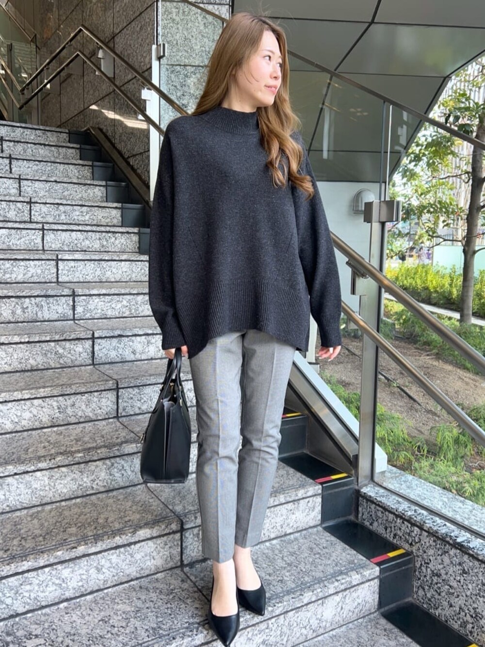 Risa 160cm 【サイズ感】トップス:Mサイズ着用。ゆったりシルエットです。ボトムス:Mサイズ着用。 スリムパンツなので足のラインにそるのでゆとりは少ないです。 【着心地】トップス:ふんわりとした軽い着心地で柔らかいニットです。着丈も長めなのでしっかりと体型カバーバッチリ。 ボトムス:美尻・美脚効果を持ちながら、ゆるシルエットで体型をカバー。伸縮性もあり履き心地◎ 【おすすめポイント】トップス:洗える素材なので、いつでも清潔感を保てます。前後差があり どんなアイテムとも相性良いです。 ボトムス:蓄熱素材「NEO THERMO」を使用し、心地よい暖かさがあり裏起毛付きなので寒い冬にもピッタリです。 【スタイリングのポイント】オフィスカジュアルコーデです!色味はモノトーンで統一感を出しています!