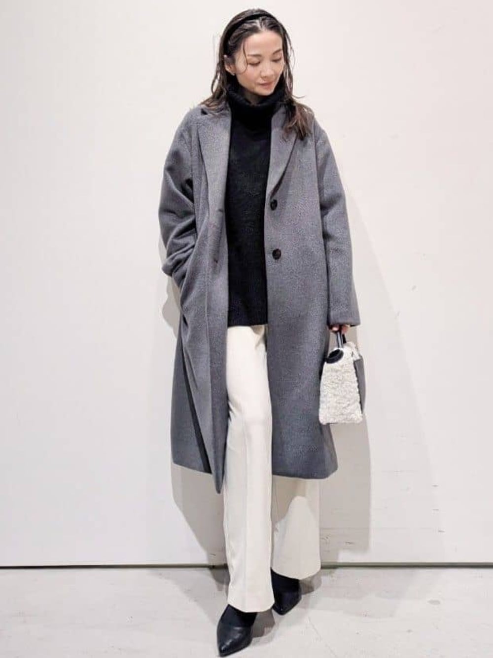 machi 157cm 【サイズ感】身長157cm ▷コート Мサイズ着用 膝が隠れるくらいの着丈になりました。 身頃は、ちょうど良かったです。 ▷ニット Мサイズ着用 ちょうどヒップが隠れるくらいの着丈になりました。 袖丈は長めです。 身頃は程よくゆとりのあるサイズ感です。 ▷パンツ Sサイズ着用 ウエストはピッタリです。 かかとギリギリくらいの丈になりました。 【素材感・着心地】 ▷コート ウールとカシミヤをブレンドした生地で、滑らかなお素材です。 ややドロップショルダーなので、肩まわりが楽でした。 【オススメポイント】 ▷コート スッキリと縦ラインを出せるチェスターコートです。 ウールの暖かさと、カシミヤの滑らかさがあり、良質なコートです! ややドロップショルダーなので、かっちりしすぎていないのも◎ ▷パンツ 裏起毛で、履いた瞬間からあたたか◎ センタープレス効果で、美脚効果も◎ 【スタイリングポイント】 チェスターコートの縦ラインでスッキリ感のある、簡単きちんとコーデです。