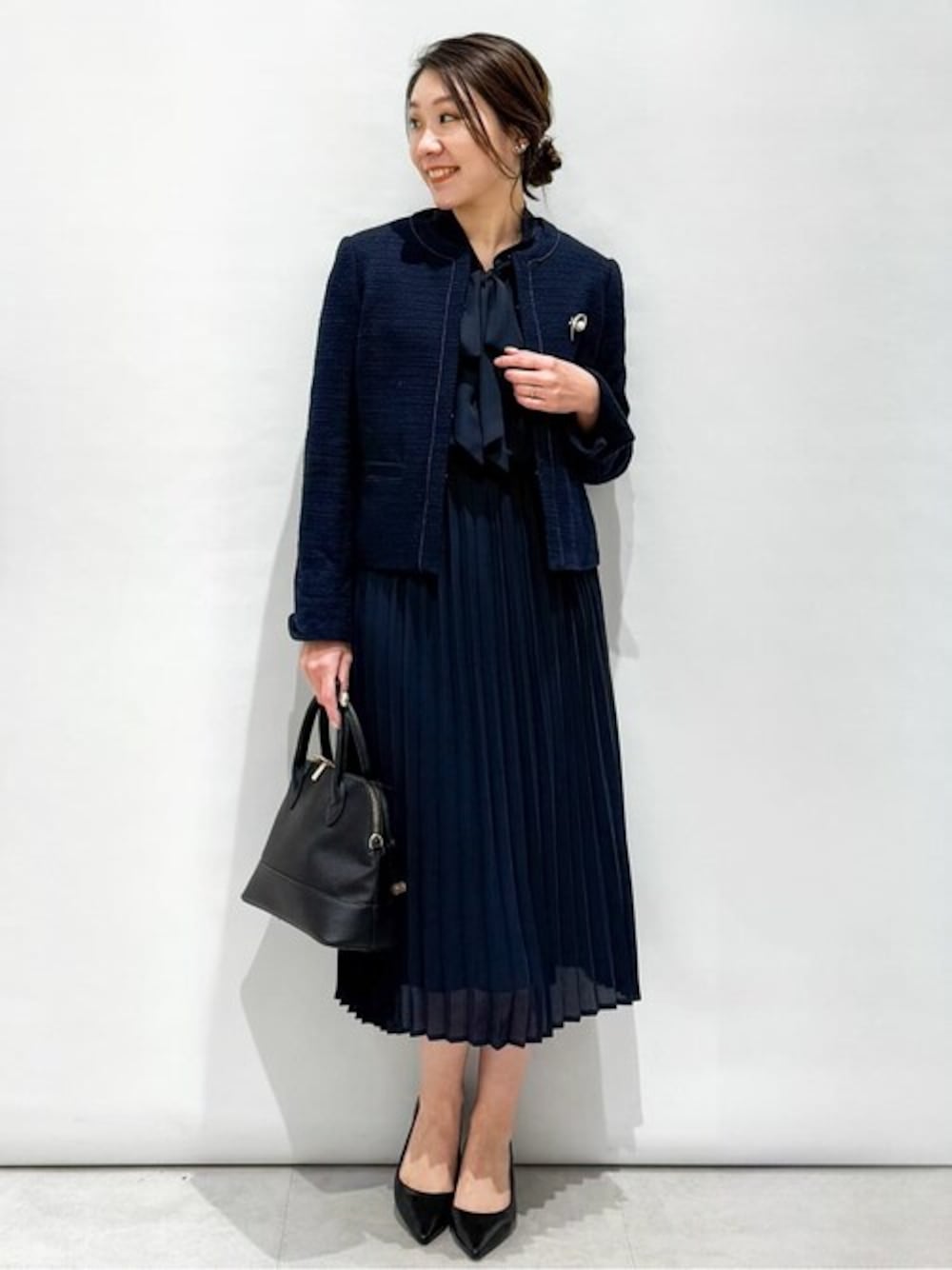 yuka.a 159cm ------------------------------------------------------------------------------------- 卒業式や入学式(卒園式・入園式)にもおすすめです。 ハレの日のフォーマルスタイリングとしても参考にしていただけると嬉しいです^ ^ ------------------------------------------------------------------------------------- 【サイズ感】 ジャケット:Mサイズ着用で程よくゆとりをもって着られるジャストサイズでした。 コンパクトめなお作りですがアームなどはゆとりもあり、すっきりと着用できました。 ワンピース:Mサイズ着用でジャストサイズでした。 程よくゆとりを持って着ることが出来るので体のラインが響かず◎でした。 身長159cmで膝がしっかり隠れる丈で、座っても安心な長さがあります^ ^ 【素材感・着心地】 ジャケット:コットンツイード素材でカッチリしすぎない程よくこなれたスタイルに仕上げてくれます。 柔らかくゴワつきなく、着心地も◎です。 変にテカリなどなく、柔らかな質感で高級感があります。 ワンピース:上品な艶が美しいジョーゼット素材でお作りしています。 軽やかさがあり動きに合わせて揺れる質感が◎です^ ^ 【おすすめポイント】 ジャケット:セレモニー定番のツイードジャケットですが、コットン素材でデイリーにも着回しして頂けるお作りになっています。 パイピング使いや美しい仕立ての、こだわりジャケットです^ ^ ワンピース:ウエスト切り替えでスカート部分が落ち感のキレイなプリーツデザインなので、スタイルアップ効果も◎^ ^! 切り替えがあるのでジャケットを合わせる際もバランス良く、とんなシルエットのジャケットとも相性抜群です。 ボウタイデザインがお顔周りを華やかに彩ってくれます^ ^ 【コーディネートのポイント】 オールネイビーカラーの定番セレモニースタイルです。 しっかりときちんと見えしながらも、ボウタイやプリーツデザイン、質感で華やかさもあります^ ^