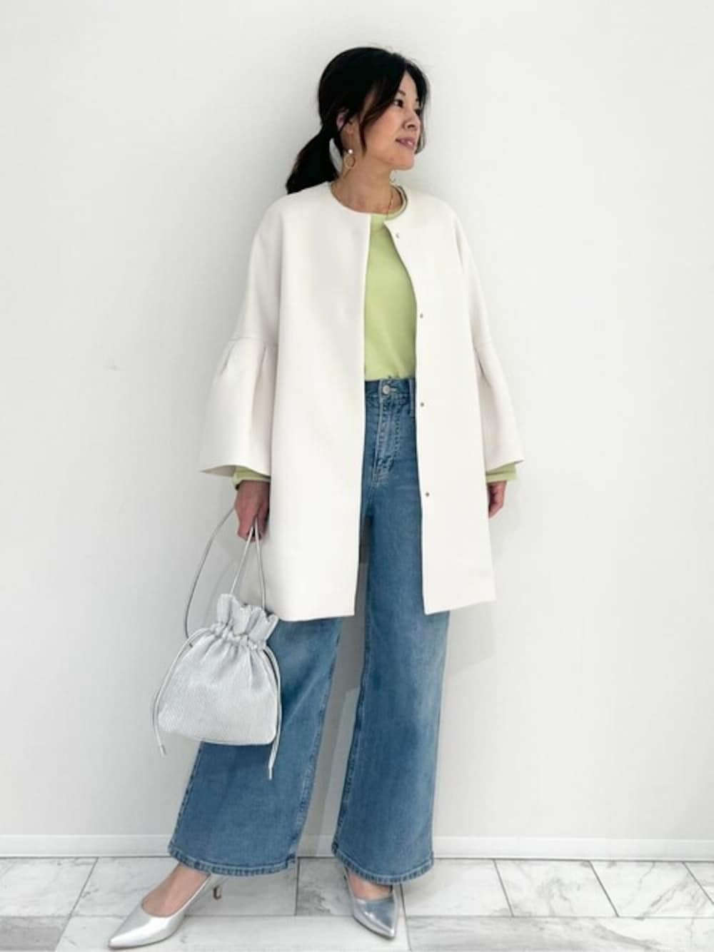 OPAQUE.CLIPスタッフ(OPAQUE.CLIP)のノーカラーコート「フレアスリーブミドルコート【洗える】」を使ったコーディネート