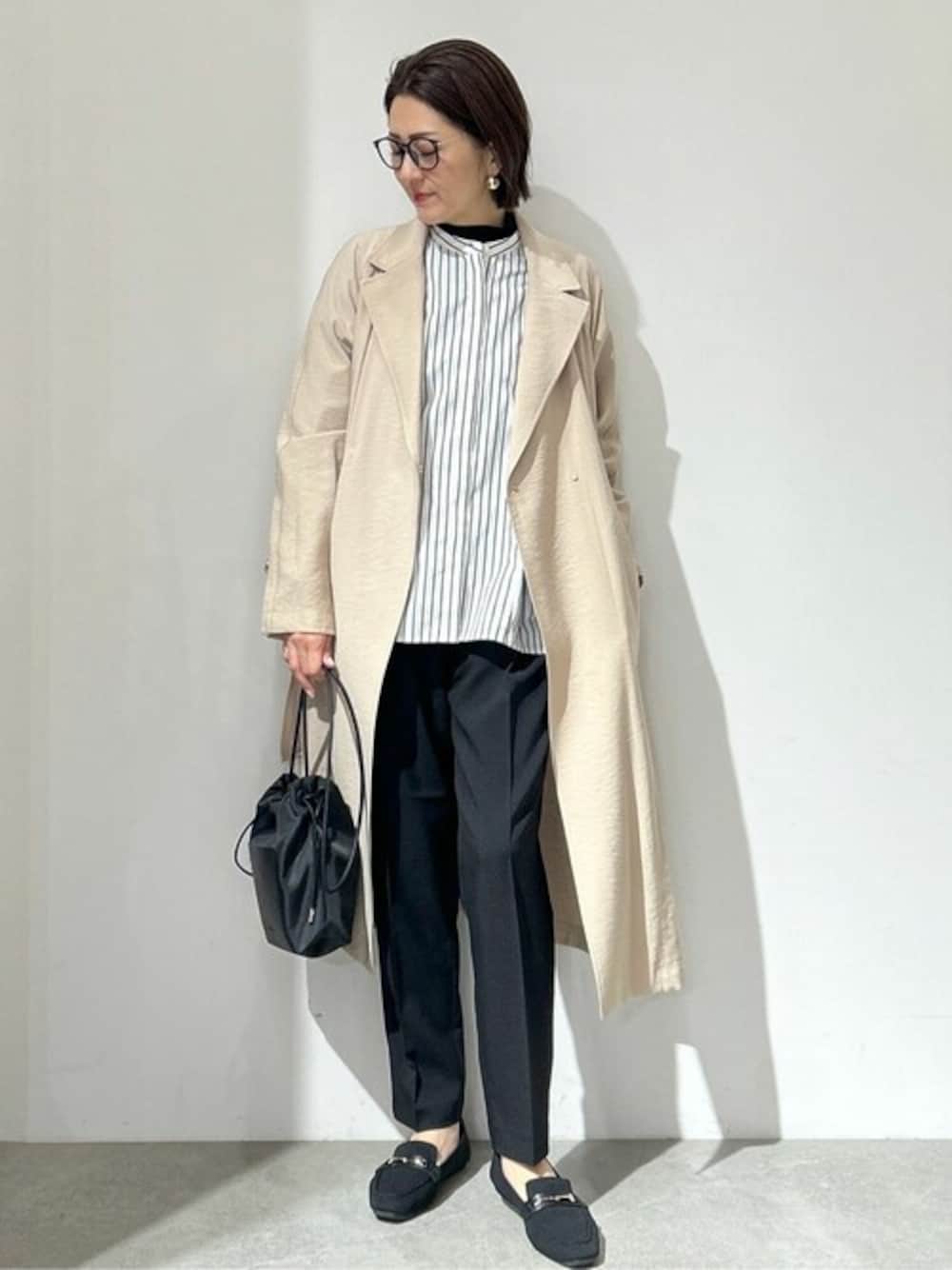 NAKA 161cm 普段着としても大活躍する、リラクシーなトレンチコートをご紹介。 通勤や、入学・卒業・入園・卒園など、セレモニースタイルにも対応。 アクセサリーなど小物を変えると、結婚式などのフォーマルなシーンにも活用いただけます。 《シルエット》 ゆとりがあるシルエット。 お袖まわりもゆったりとしていますので、ボリュームスリーブトップスとも相性が良いです。 《素材感・着心地》 落ち感がある素材感です。 広がる素材では無いので、すっきりと細見えします。 《おすすめポイント》 春秋の定番アイテムです。 高級感がある見た目が気に入っています。 《スタイリングポイント》 ストライプシャツとテーパードパンツを合わせて、オフィスにも着られるスタイリングにしました。 ローファーで、キッチリ感をプラスしています。