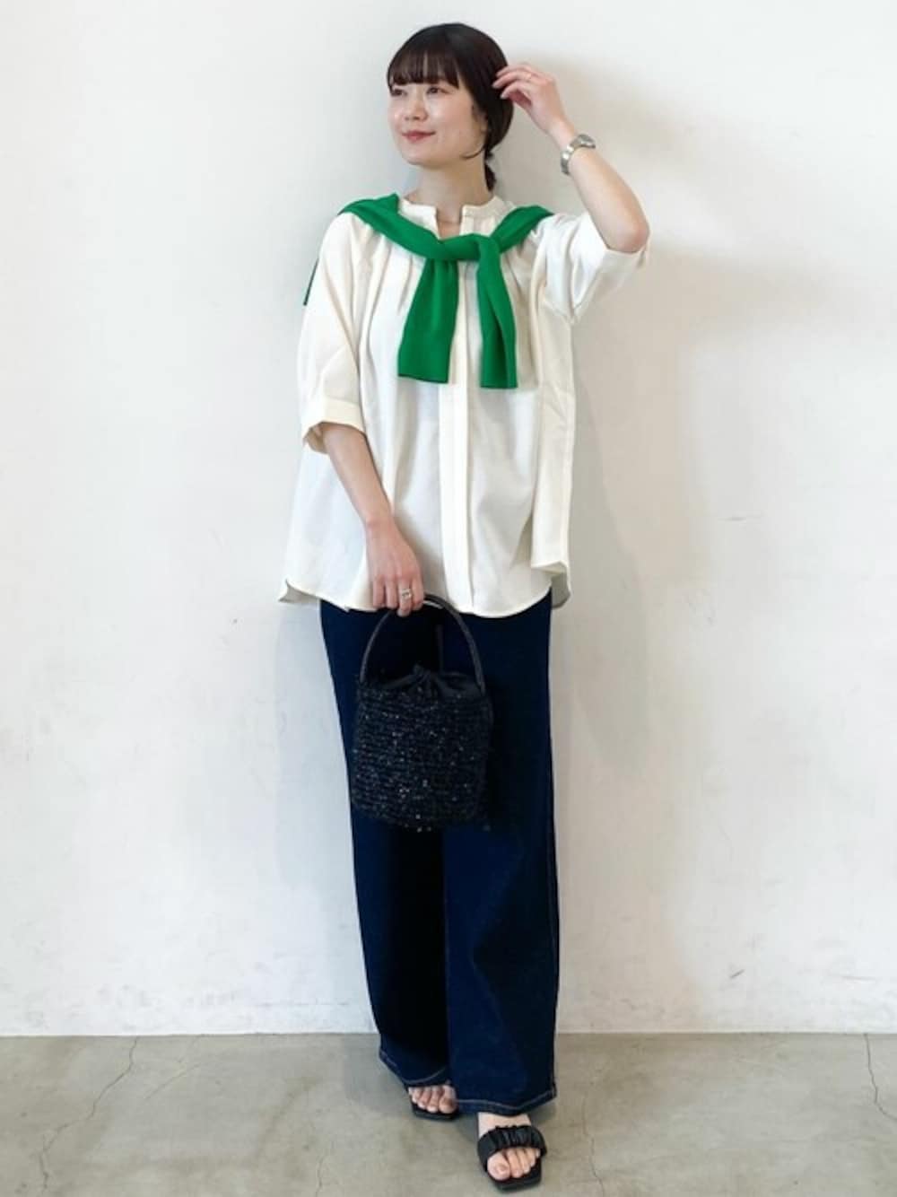 haru 156cm 【サイズ感】 ・カーディガン 程よくコンパクトなサイズ感で肩掛けもしやすいです◎ ・トップス ゆったりめです。腰にかかる着丈で体型カバーにもなります◎ ・パンツ ゆったりめです。156センチSサイズ着用で着丈はぴったりでした! 【素材感・着心地】 ・カーディガン さらっとしたニット素材で長いシーズン着用しやすいです。 ・トップス さらっとした肌触りで春夏にぴったりです。麻調のポリエステル素材で、涼しげな印象になります◎ ・パンツ ストレッチの効いたデニム素材でストレスフリーな着心地です。 【おすすめポイント】 スキッパーブラウスは顔まわりがスッキリと見えます♪大人カジュアルなスタイリングにぴったりです! 【スタイリングポイント】 白のスキッパーブラックとデニムを合わせてきれいめカジュアルなスタイリングにしました!