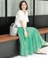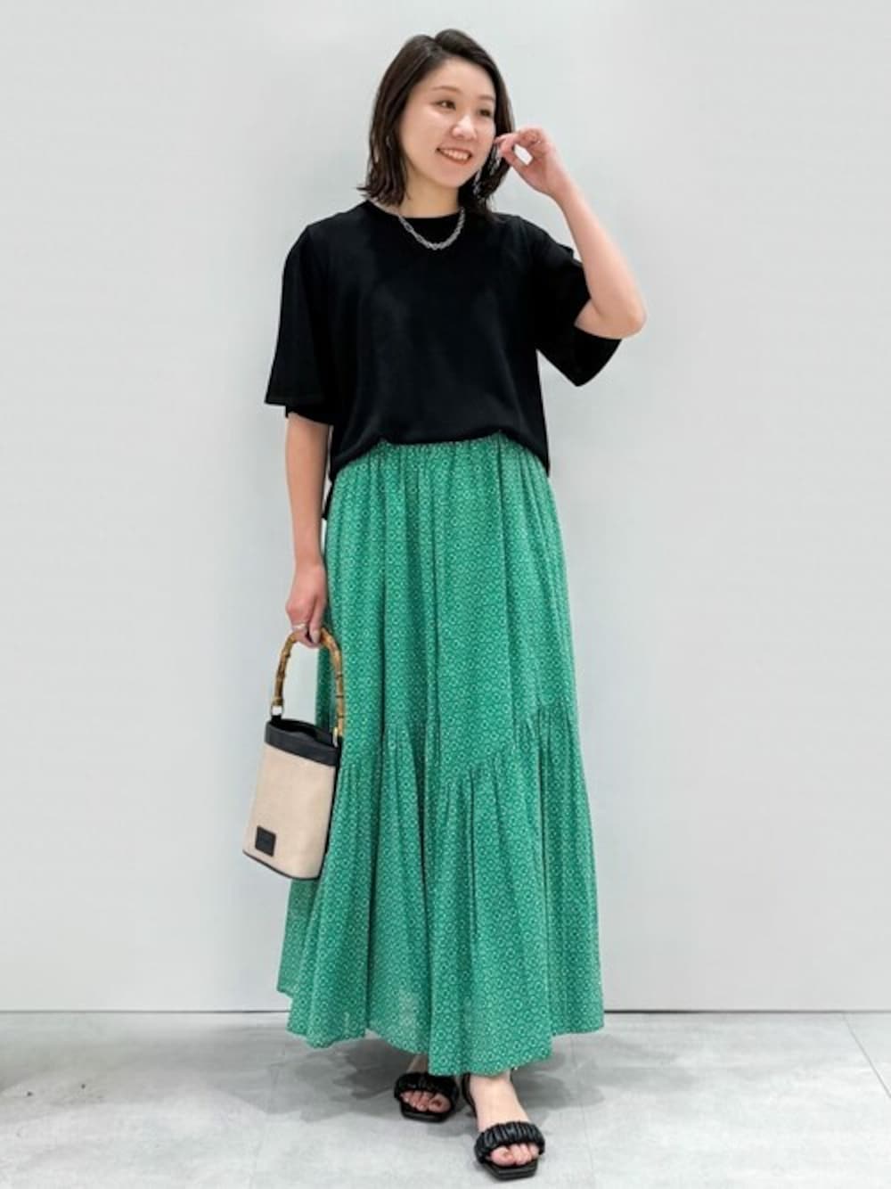 yuka.a 159cm 【サイズ感】 トップス:Mサイズ着用 程よいゆとりをもって着られるサイズ感でした。 丈はアウトでもバランスの取りやすい長さが◎! お袖も肘上ほどの安心な長さでした。 スカート:Mサイズ着用 ウエストにややゆとりがありましたが、ゴム仕様で問題なく着用できました。 そのぶん少し腰位置が下がるため、身長159cmで足首の隠れる丈です。 フラットシューズでも地面にはつかない長さでした。 【素材感・着心地】 トップス:接触冷感・UVケア機能付きで、さらりと夏に快適に着られるお素材です。 レーヨン・ナイロン混特有の美しい落ち感と艶がキレイ見えを叶えてくれます。 スカート:良質なオーガニックコットン混でとても柔らかく、ボリューム感があるのに軽く、着心地◎です。 ウエストは総ゴム仕様で締め付け感がなく、快適な穿き心地です^ ^ 【おすすめポイント】 トップス:ベーシックなシルエットなので着回し力がとても高く、ON/OFFどちらにもオススメです! お袖のフレアデザインが二の腕をカバーしてくれ、甘くならない大人らしいデザインです^ ^ スカート:ギャザーの寄せ方や切り替えでボリューム感はあるものの、全体的には広がらずに上品な大人シルエットのフレアスカートです^ ^! 切り替えを斜めに入れたことでより動きが出ておしゃれ見えも◎です。 特別感のあるお素材とデザインが、着るだけでワクワクした気持ちになります^ ^ 【コーディネートのポイント】 スカートを主役に、大人女子らしくブラックのきれいめなアイテムを合わせました。