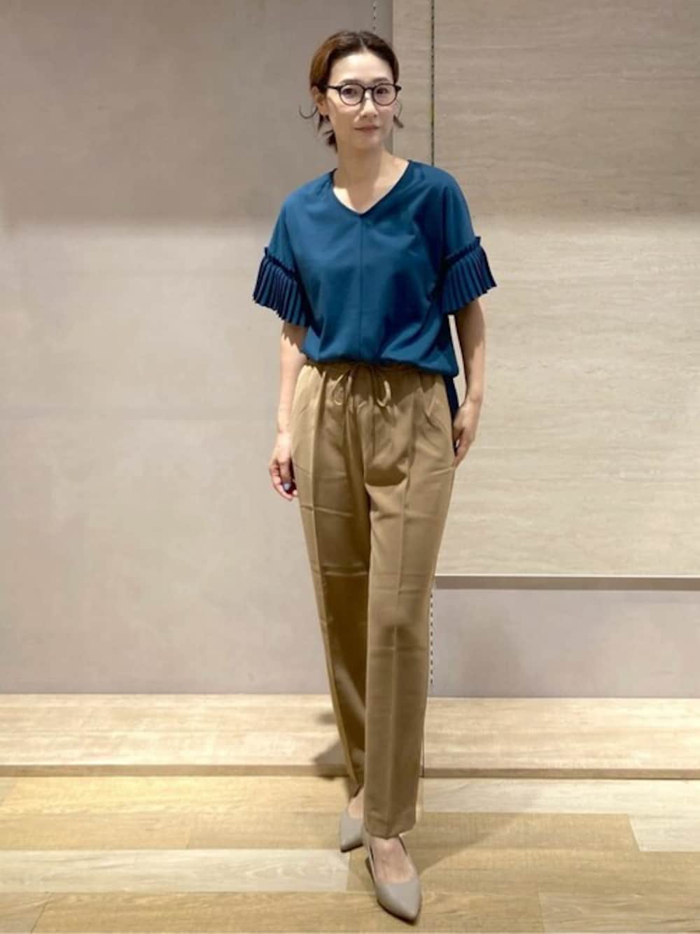 T 163cm 【サイズ感】トップス、パンツMサイズ着用。トップスは襟元の空きは広すぎず着用できます。 着丈は後ろが長くインしやすいゆとりがあります。 パンツはウエストゴムの緩めなサイズ。 【着心地、素材感】トップスは落ち感ある生地。ゆったりしているので身体のラインも拾いません。 パンツは薄手のテロっとした生地。 裏地あり。 【おすすめポイント】お袖のプリーツがブラウス見えして、オフィススタイリングでのアレンジも可能! 【コーディネートポイント】秋カラーを使ったシックな大人のオフィスカジュアルコーディネートです。