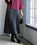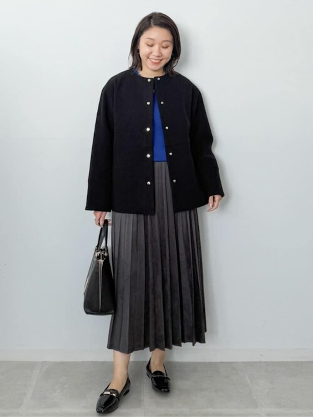 yuka.a 159cm 【サイズ感】 アウター:Mサイズ着用 ゆったりと着られるボクシーなサイズ感で、インナーにざっくりとしたニットを着た場合にも◎です! ドロップショルダーなので肩周りもゆとりがありました。 トップス:Mサイズ着用 ラグランスリーブでゆったりとしたサイズ感ですが、着丈がややショート丈なのですっきりとバランスの良いシルエットでした。 スカート:Mサイズ着用 着丈は159cmで足首上くらいの長さでした。 ストンとした広がらないシルエットなので重たくならず、すっきりとお召し頂けます。 ウエストはややゆとりがありましたが、ゴム仕様でトップスをインする場合◎でした。 【素材感・着心地】 アウター:ウール見えする柔らかな生地です。 お取り扱いしやすいお素材を使用しているので、お手入れしやすく、アウターでありながらマシンウォッシャブル対応となっています。 トップス:エクストラファインメリノウール混の柔らかく上質なお素材を使用しています。 イタリア産の糸だけあり、美しい発色と光沢がポイント! ウール混でありながら、マシンウォッシャブル対応なのも嬉しいですよね^ ^ スカート:滑らかで落ち感のあるフェイクスエード素材のお作りです。 動きに合わせて揺れる軽やかさが◎! やや光沢があるのでキレイめな印象です。 【おすすめポイント】 アウター:キレイめで上品な印象のノーカラーコートで、様々なシーンにお使い頂けます。 シンプルなデザインな分、カジュアルにも◎です。 見えても◎にデザインされた、シャンパンゴールドのボタンや、お袖や裾の切り替えラインなど、単調にならないデザインがポイントです^ ^! トップス:カラーバリエーション豊富な6色展開で、お好みのカラーが見つかるニットです^ ^! オンオフ使える着回し力の高さと、上質なお素材で秋冬活躍間違いなしです! スカート:毎シーズン大人気のフェイクスエード・ イージープリーツスカートが更に進化して登場しました! プリーツ幅がやや広くなり、丈も少し短くなっています。 カジュアルなトップスともキレイめブラウスとも相性◎な着回し力の高さと、季節感をプラスできるオシャレなアイテムです^ ^ 【コーディネートのポイント】 モノトーンスタイルにインナーのブルーのニットを差し色に効かせたコーディネートです^ ^