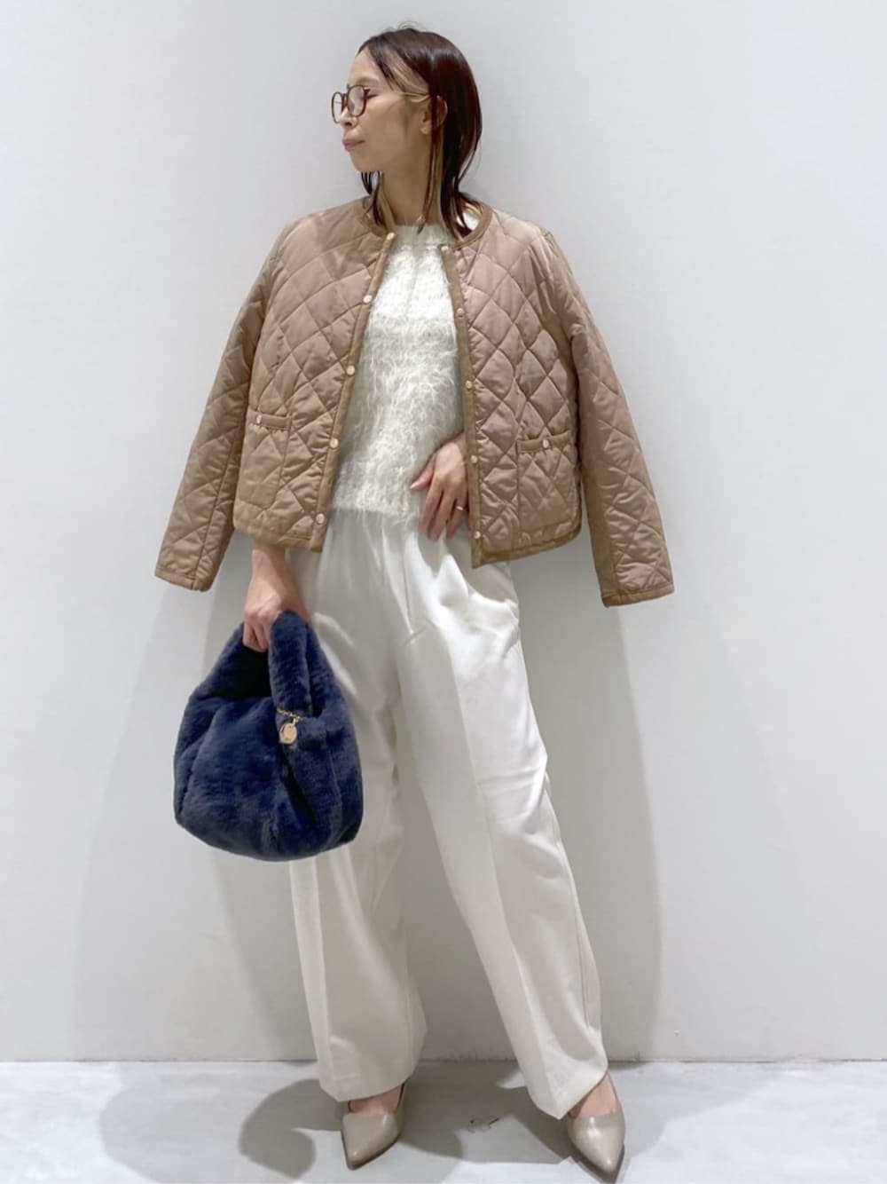 えり 156cm 【サイズ感】 キルティンジャケット:Mサイズ着用ゆったりめ。ジャストサイズはSサイズ。ボリュームのあるニットをあわせるならMサイズ。着丈はヒップがでます。 袖が長めですがターンアップすれば◯ ニット:Mサイズ着用、程よいゆとり感です。着丈は少しヒップがでるくらいです。 ワイドパンツ:Sサイズ着用ウエスト大きめ、足回りゆったりめ。ウエストはドローコード仕様なので絞れば穿けますが、SSサイズがより綺麗に穿けそうです。 【着心地.素材感】 キルティングブルゾン:蓄熱綿を仕様していて薄くても暖かな着心地です。 撥水仕様のキルティングのデザイン。マシンウォッシャブル対応でお家でお手入れして頂けます。 ニット:フェザーヤンのボリューム感でふわふわとしと着心地です。 マシンウォッシャブル対応、アンチピリングです。 ワイドパンツ:ストレッチが効いてます。微起毛になっているのでこれからの季節に穿いていただけます。 【おすすめポイント】 キルティングジャケット:上品なシャンパンゴールドのドットボタンが特徴。さりげないお洒落が楽しんで頂けます。 オーバーコートの中にライナーとして着用頂いて寒い冬も◯ ニット:肘にかかるくらいの袖丈でジャケットなどと合わせても。 ワイドパンツ:同素材でテーパードパンツ(637-64011)のお作りもございます。是非ご覧下さい。 【スタイリングポイント】 お出掛けスタイリング。