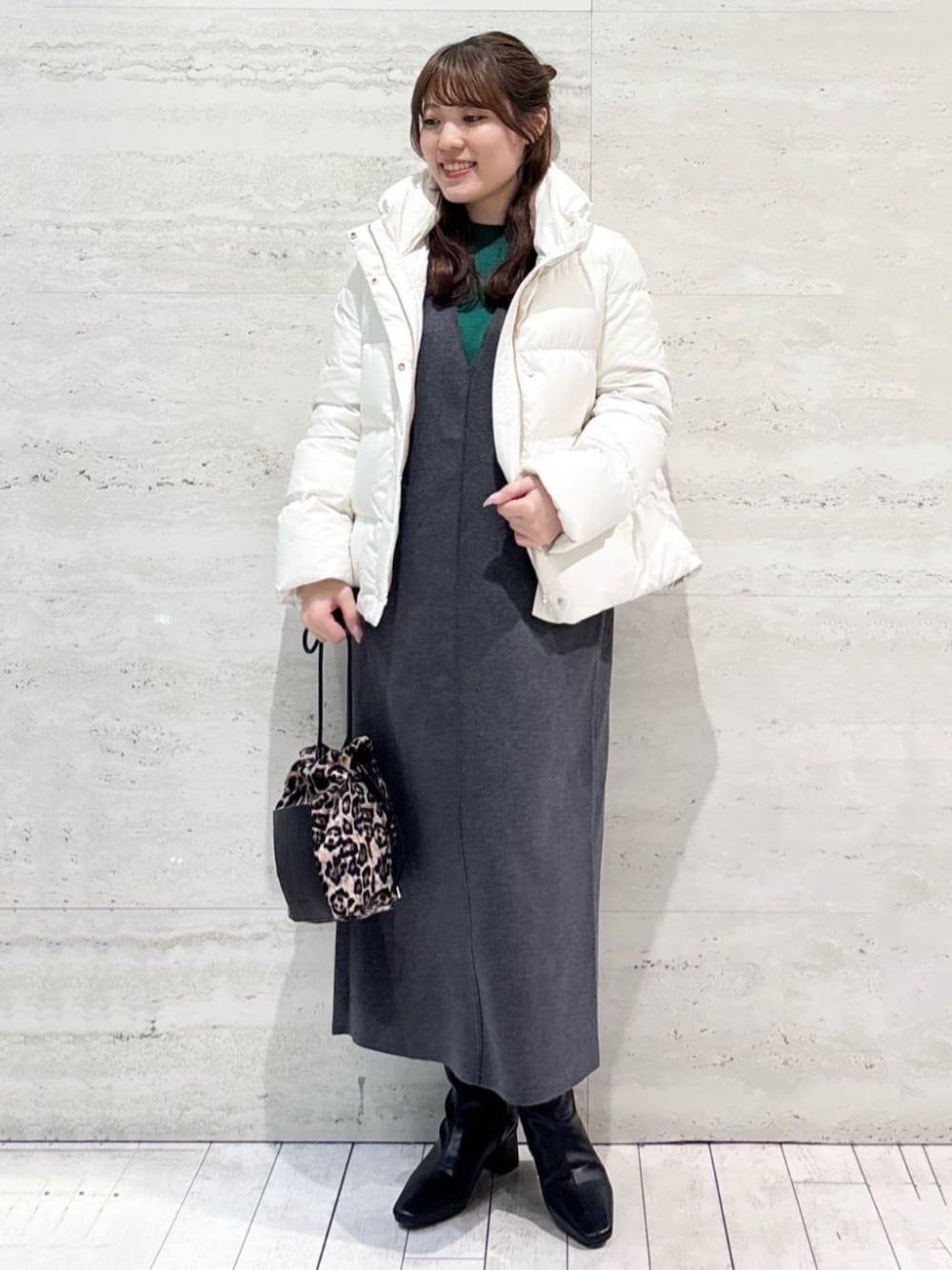 かほ 153cm 【サイズ感】 ダウン:36サイズ着用でゆったりしています。お尻半分くらいまで隠れる丈感です。 トップス:38サイズ着用で全体的にゆったりしています。 ワンピース:38サイズ着用で横がかなりゆったりしています。 【着心地・素材感】 ダウン:とても軽くで羽織りやすいです。 トップス:とても柔らかくて着心地が良いです。ニットですが、チクチクしません。 ワンピース:とても軽くて着やすいです。 【オススメポイント】 ワンピースのシルエットがとても綺麗です! 【スタイリングポイント】 カジュアルにスタイリングしてみました♪