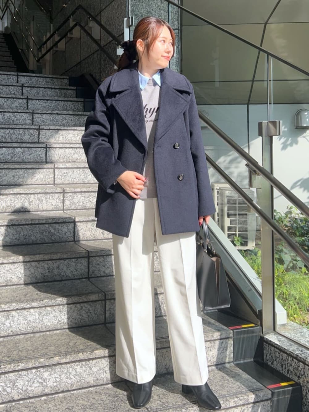 Risa 160cm 【サイズ感】 アウター:Mサイズ着用。オーバーサイズでゆったりします。その分、分厚めのニットなど中に着込めます。 トップス:フリーサイズです。程よくゆとりがありますが大きすぎずジャストサイズです。 ボトムス:Mサイズ着用。丈感が欲しいため160㎝の私はMにしました。 【着心地】 アウター:コートの中でも軽くそして暖かく着用できます。カシミヤの毛も使っているので毛羽立ちもなく柔らかく上品に着こなせます。 トップス:もちっと柔らかく肌触りの良いニットです。裾のリブ感も程よくとまるのでキレイめやカジュアルなど合わせやすいです。 ボトムス:ウエストゴムなので楽ちんです。 伸縮性があり動きやすさも◎ 【おすすめポイント】 アウター:大きな襟が可愛いです!毎年人気のPコートです。 トップス:襟の付け外しが可能。有無でも雰囲気変わります! 首元が割と詰まっているので着用際は襟のボタンの前だけ外すと着用しやすいです。 ボトムス:薄らと裏起毛が付きいており蓄熱素材なのてで暖かく冬に便利アイテムです。 【スタイリングのポイント】襟のブルーシャツが アクセントになりシンプルで大人っぽく着こなしてみました。
