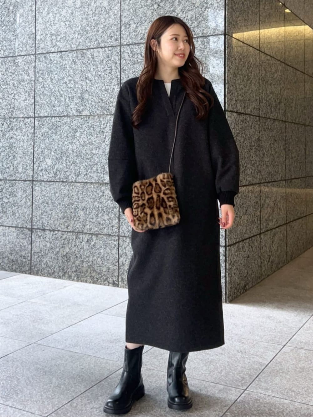 Risa 160cm 【サイズ感】 ワンピース:Mサイズ着用。ゆったりと程よくゆとりがあります。160㎝で足首は見える長さですがブーツなど合わせやすい丈感です。 【着心地】 ワンピース:とても軽くそしてウール調のワンピースなのでこれからの寒い時期にもピッタリです。 【おすすめポイント】 ワンピース:ボリュームのあるお袖と袖口がリブになっているのでデザイン性があります。 首元の開きが気になる方はロンTやシアーのインナーでの重ね着をオススメします。 【スタイリングのポイント】 シンプルになりすぎないようにカジュアルに ヒョウ柄のバックをアクセントにしてみました