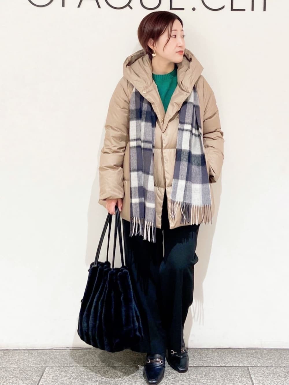 MIHO 154cm 《サイズ感》 ダウン…Sサイズ着用で、厚手のニットも楽に着れました。 裾にかけてやや広がるAラインシルエットで気になる下半身のカバーも◎ お袖は、袖口の内側にリブが付いているので袖丈も気にならず着て頂けます。 (着用画像10枚目はお色違いのMサイズを着用しています。) ニット…Mサイズ着用で、程良いゆとりで楽に着れます。 フィットし過ぎないので、インナーも中にレイヤードできます。 前後差のあるシルエットなので腰周りのカバー◎ パンツ…Sサイズ着用で、ウエストゴムなので お腹周りの肉付きが良い私でもピッタリでした! 丈感は身長154センチの私で、スニーカーや ぺたんこ靴でも大丈夫でした♪ 《素材感・着心地》 ダウン…とっても軽く、良質なダウンを使用しているので、保温性は確保しながら、着ぶくれしないシルエットです♪ フード付きですが、柔らかな風合いできれいめ見えするので、カジュアル過ぎず、通勤やおでかけのきれいめアイテムとも相性◎ 高見えします♡ ニット…程良い厚みのあるミドルゲージニットです。チクチク感は無く、柔らかく着やすいです! お手入れしやすいマシンウォッシャブル素材です。 パンツ…裏起毛で蓄熱機能付きなので、 暖かく着て頂けます。 ストレッチが効いていて、履き心地抜群です‼︎ マシンウォッシャブル対応で、洗った後の取り扱いもしやすいイージーアイロン機能付き♪ 《おすすめポイント》 ダウン…袖口はリブデザインで冷気の侵入を防御し、表地には、高い撥水性のある機能素材を使用し、雨や雪に強く、通勤やお子様の送迎など これからの寒い時期に活躍するダウンです! マシンウォッシャブルでお手入れが簡単なところも嬉しいポイント☆ ニット…後ろボタンがポイントになりオシャレ見えします。 きれいめにもカジュアルにも着回し◎ 年齢問わず店舗でも大人気です♡ 程良い厚みで1枚着もしやすいデザインです。 パンツ…ワイドパンツは太って見えたり、丈が長過ぎたりと身長が低い私は敬遠しがちでしたが、 こちらはワイド過ぎず、丈感も長過ぎないので スッキリ着て頂けます!! 小柄な方や下半身が気になる方にオススメです☆ 《スタイリングポイント》 暖かいベージュのダウンに鮮やかなグリーンニットで差し色を。 チェックストールで季節感をプラスしつつ、黒小物で全体をきれいめに引き締めた通勤にもデイリーにもオススメな大人カジュアルコーデです。