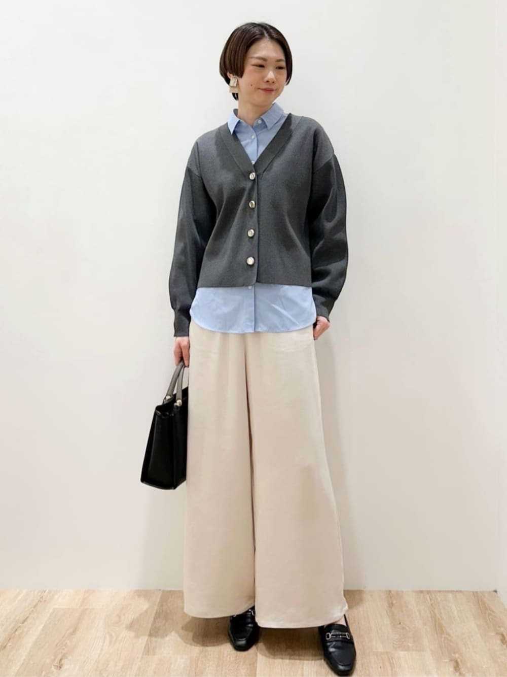 yurie 167cm 【スタイリングポイント】 カーディガン×シャツ×ワイドパンツを合わせたシンプルキレイめスタイリングです!春先まで着られるお仕事やお出かけにオススメのスタイリングにしました! 【オススメポイント】 カーディガン・金ボタンがアクセントになりお洒落なアイテムです!Vネックデザインなのでスッキリ見えも叶い中に合わせるトップスも選ばず着られます! 【サイズ感】 カーディガン・Mサイズ着用。シャツの上に着てもまだゆったり着られます!スッキリ着られるショート丈です! シャツ・Mサイズ着用。程よくゆとりはありつつ丁度良いサイズ感です!後ろはお尻が隠れる丈感です! パンツ・Mサイズ着用。ウエストゆとりがありますが紐で調節できるので安心です!167cmでフルレングスで着られました! 【素材感•着心地】 カーディガン・程よい厚みと張り感のあるお素材で毛玉になりにくいのもオススメです!マシンウォッシャブルなのでご自宅でお洗濯可能です! シャツ・ポリエステル×コットン素材でサラッと着られ着心地◎です! パンツ・ウエスト総ゴムなので楽ちんに着られます!サテン素材で光沢感と落ち感もあり上品に着られます!