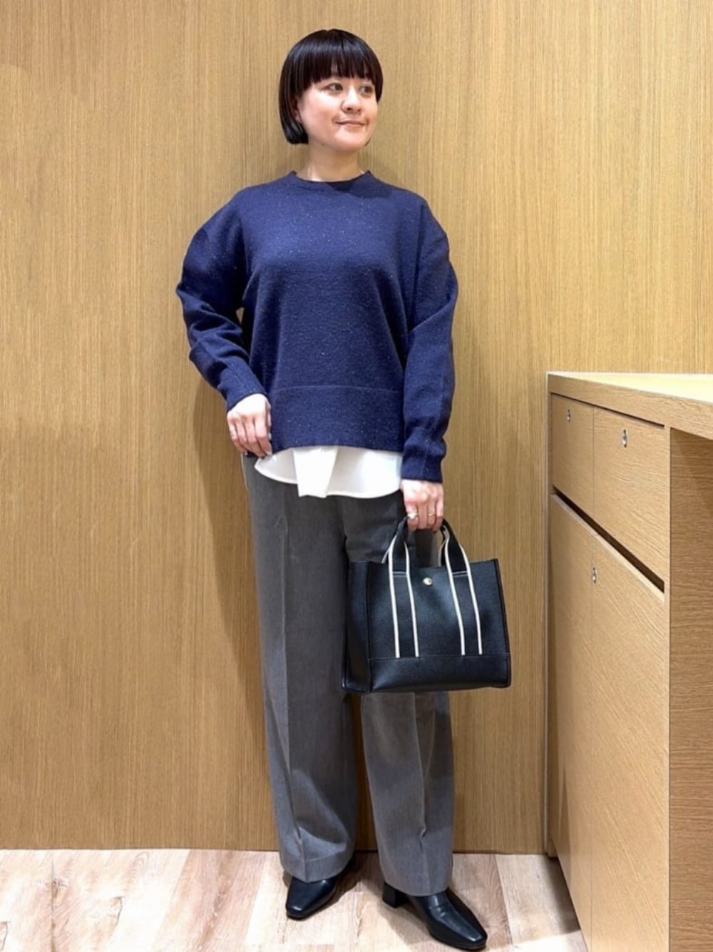 chiaki 157cm 【サイズ感】 ・ニット 身幅はシャツなどのインナーでも着られるゆとりがあります。 ・インナー デコルテしっかり開いております。着丈はヒップまであります。 ・パンツ 全体的なゆとりがあり非常に楽です。 【素材感】 ・ニット ラメが入ってますが固くなくチクチク感は気になりにくかったです。 ・インナー 薄手なので外に響きにくいです。 ・パンツ 裏地はついてないですが肌あたりの柔らかい温かい生地です。そこまで厚手ではないです。 【おすすめポイント】 レイヤードしなくても長さが絶妙なのでボトムスを選びません! 【スタイリングポイント】 チラ見せのインナーをポイントに、大人めなレイヤードスタイリングにまとめてます♪