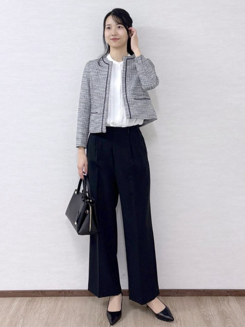 sachiko 174cm 【スタイリングポイント】 モノトーンでまとめたセレモニースタイル。 バッグは明るいカラーをチョイスして重すぎないように合わせました。 【おすすめポイント】 *ジャケット コンパクトなシルエットでボトムスも合わせやすいデザイン。 セレモニーシーンにはもちろん、通勤やディリー使いにも使いやすいツイードデザインです。 フロントがホックになっていてシンプルなのでインナーも合わせやすいのがポイントです。 *ブラウス フロントのタックデザインが上品な印象に。 1番上のボタン以外は見えない仕様になっているので、羽織アイテムも合わせやすいのがポイント。 *パンツ シンプルなワイドパンツは、落ち感のきれいなワンタックデザイン。 同素材のジャケットとの着用もおすすめですし、デイリー使いもしやすいベーシックなデザインなので色々なシーンに着回せます。 洗濯機okなのも嬉しいポイントです◎ 【着心地】 *ジャケット 見た目以上に柔らかく、快適な着心地です。 *ブラウス さらっとしていて着心地良いです。 *パンツ バック部分がゴムになっているので安心感があります。 さらっとしてるので穿き心地も快適です。 【サイズ感】 *ジャケット Mサイズ着用。 肩はピッタリだったのでもう少し余裕を持ってワンサイズ上げても良いかなと思いました。 袖は手首が見えるすっきりとした長さです。 *ブラウス Lサイズ着用。 肩の感じはピッタリでした。 袖は手首にかかる長さです。 *パンツ Lサイズ着用。 ウエストは少し余裕がありました。 くるぶしにかかるくらいの長さです。